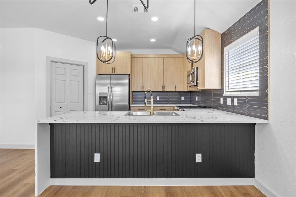Step inside this stunningly updated single-story home offering 1,679 sq. ft., 4 bedrooms, and 2 full baths. Every detail has been thoughtfully designed with modern finishes and stylish touches throughout. The open kitchen features quartz countertops with a waterfall-edge peninsula and breakfast bar, stainless steel appliances, and luxury wood cabinetry accented with black and gold fixtures—a space that blends beauty and function. Enjoy the warmth of wood-look luxury vinyl plank flooring throughout the home, giving every room a timeless yet practical touch. Both bathrooms are sleek and modern, designed with comfort in mind. Outside, relax or entertain under the huge covered patio, and oversized backyard perfect for Texas evenings. Location is everything—and this home delivers. Just 5 minutes from the new Samsung plant, this property offers an easy commute while still being close to the charm of downtown Taylor, where you’ll find a growing mix of boutique shops, local restaurants, live music, and small-town entertainment. Taylor is known for its award-winning barbecue, arts scene, historic downtown square, and year-round festivals, making it a place where community and convenience meet. This home blends style, comfort, and location—a perfect lease opportunity in one of Central Texas’s fastest-growing cities.