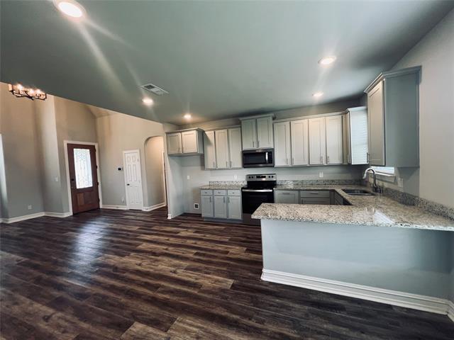 Stunning vaulted ceiling welcomes you into the gorgeous inviting family home. Warm designer colors, granite counter tops in kitchen and baths, 2 car garage, 3 bedrooms, 2 baths, large over sized manicured lawn! Kitchen has stainless steel appliances that include, smooth top electric range, microwave vent, dishwasher! Luxury vinyl plank flooring in living areas and wet areas. Carpet in bedrooms. Ceiling fans throughout the home. Serene primary bedroom with raised ceiling and en suite! Walk in closet, dbl sink vanity, separate commode area. Ample sized guest bedrooms, with full bath located conveniently across the hall. Utility closet with full size washer and dryer capacity. Location is close to downtown, shopping, and schools. Very few homes of this quality and affordability are available.