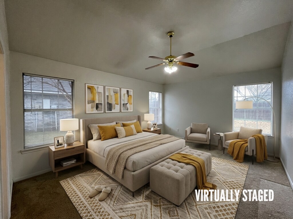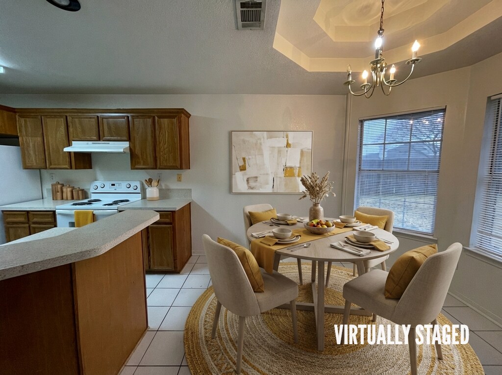 View 360 virtual tour: Explore this 3-bedroom, 2-bathroom single-family home located in Killeen, Texas. This property offers a thoughtful layout with ceramic tile, vinyl plank, and carpeted flooring throughout. The entry foyer opens into a welcoming living area featuring a classic brick fireplace and a formal dining room. The kitchen includes traditional white appliances, an in-kitchen dining area, a breakfast bar, and plenty of cabinet space for everyday convenience. The primary bathroom features a soaking tub, double vanity, separate shower, and a large, spacious closet. The secondary bathroom offers generous counter space and a practical layout for shared use. Additional highlights include ceiling fans throughout the home, a laundry room with washer and dryer connections along with built-in storage cabinets, and a fenced-in backyard with a covered patio ideal for outdoor relaxation. A 2-car attached garage and driveway parking provide convenience and additional storage options. This Killeen home delivers comfort, functionality, and a layout suited for a wide range of needs. Contact us today to schedule a tour and make this beautiful home yours! Disclaimer: The furnishings or enhancements shown are AI-generated and intended for inspiration only. They may not reflect the actual scale, condition, or current features of the property.