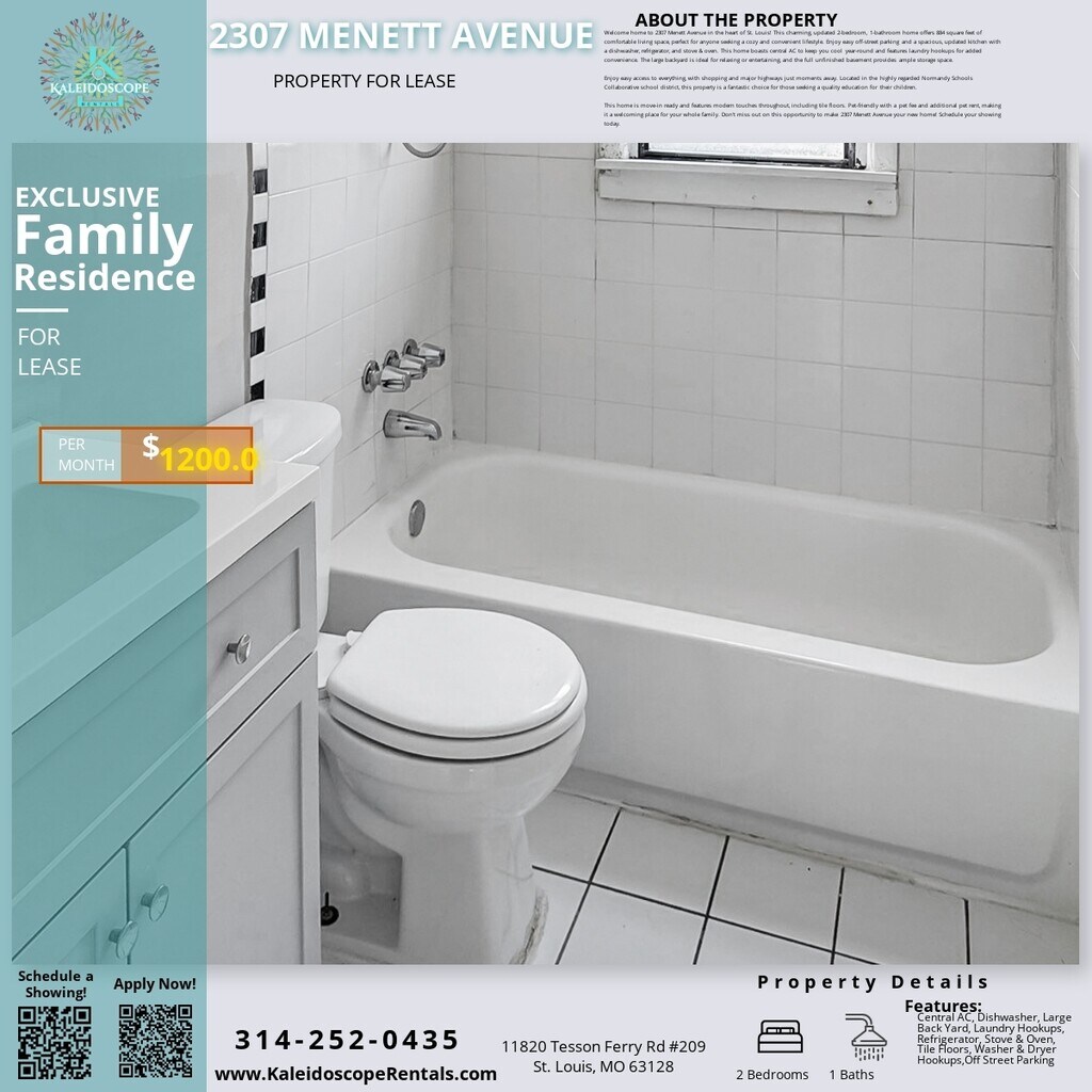Welcome home to 2307 Menett Avenue in the heart of St. Louis! This charming, updated 2-bedroom, 1-bathroom home offers 884 square feet of comfortable living space, perfect for anyone seeking a cozy and convenient lifestyle. Enjoy easy off-street parking and a spacious, updated kitchen with a dishwasher, refrigerator, and stove & oven. This home boasts central AC to keep you cool year-round and features laundry hookups for added convenience. The large backyard is ideal for relaxing or entertaining, and the full unfinished basement provides ample storage space. Enjoy easy access to everything, with shopping and major highways just moments away. Located in the highly regarded Normandy Schools Collaborative school district, this property is a fantastic choice for those seeking a quality education for their children. This home is move-in ready and features modern touches throughout, including tile floors. Pet-friendly with a pet fee and additional pet rent, making it a welcoming place for your whole family. Don't miss out on this opportunity to make 2307 Menett Avenue your new home! Schedule your showing today.