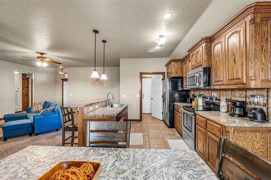 Welcome to this beautifully maintained home nestled in the desirable Rolling Hills addition, perfectly situated on a quiet cul-de-sac. Offering approximately 1,500 square feet of well-designed living space, this three-bedroom, two-bath residence combines comfort, quality finishes, and modern convenience. Step inside to enjoy soaring 10-foot ceilings and a warm, inviting living area highlighted by a gas log fireplace, ideal for relaxing or entertaining. The kitchen is thoughtfully appointed with custom oak frame cabinetry featuring euro hinges, stainless steel appliances, and durable ceramic tile flooring, and oil rubbed bronze fixture theme flows throughout the home, adding a cohesive and timeless design touch. Additional features include double pane windows for energy efficiency, a built in security system, and a covered patio that extends your living space outdoors, perfect for morning coffee or evening gatherings. The two car garage provides ample storage and parking. YOU MUST PRE-QUALIFY BEFORE WE WILL SCHEDULE A VIEWING APPOINTMENT.