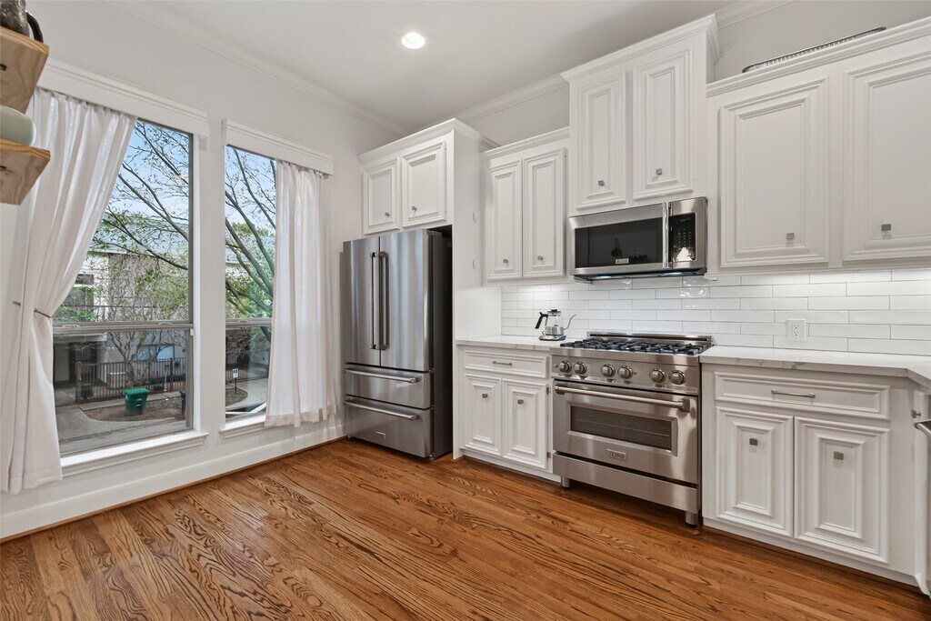 Enjoy city living with a spacious rooftop terrace offering views of Minute Maid Park,the Toyota Center,the Medical Center,and NRG Stadium,plus a gas line ready for rooftop grilling. Inside,the kitchen opens to the dining and living areas and extends to a 126 sq. ft. balcony,creating great flow for entertaining. The home features premium Zline appliances,hardwood and tile flooring,and a freshly painted interior. The spacious 15x15 primary suite includes a sitting/study area,a large bath,and a huge walk-in closet. The first-floor bedroom has its own full bath,walk-in closet,and patio access. Updates include high-end faucets,Kohler toilets,tall ceilings,a gated entrance,and an automated garage door. Located minutes from EaDo’s dining and entertainment,this home offers style,comfort,and convenience. MLS# 64766998