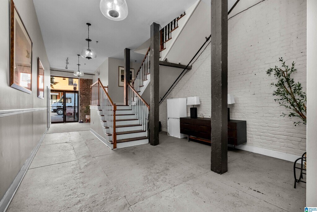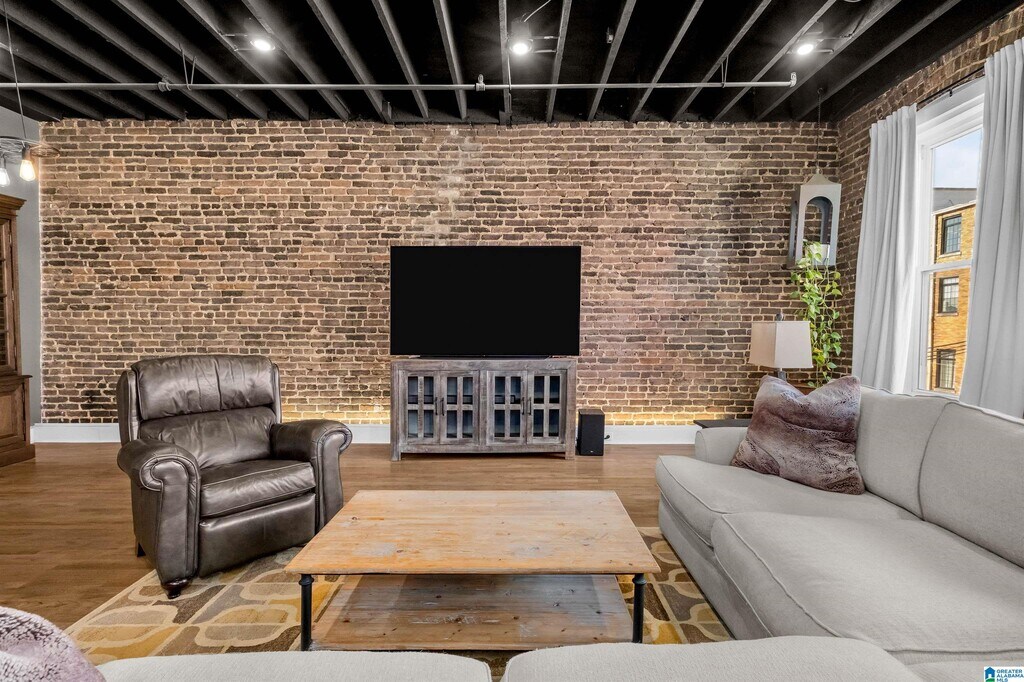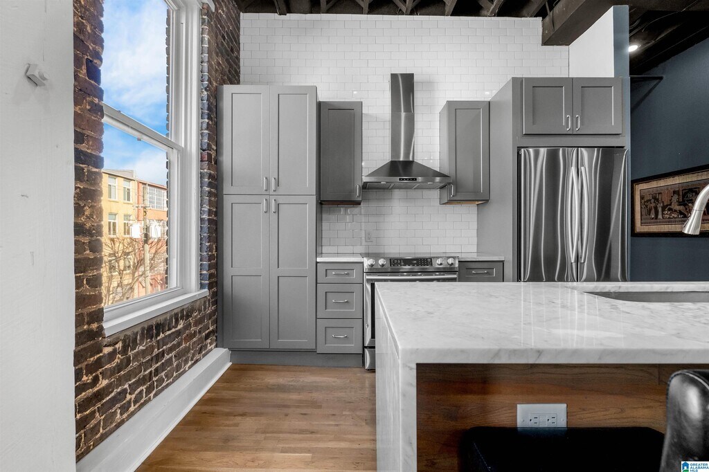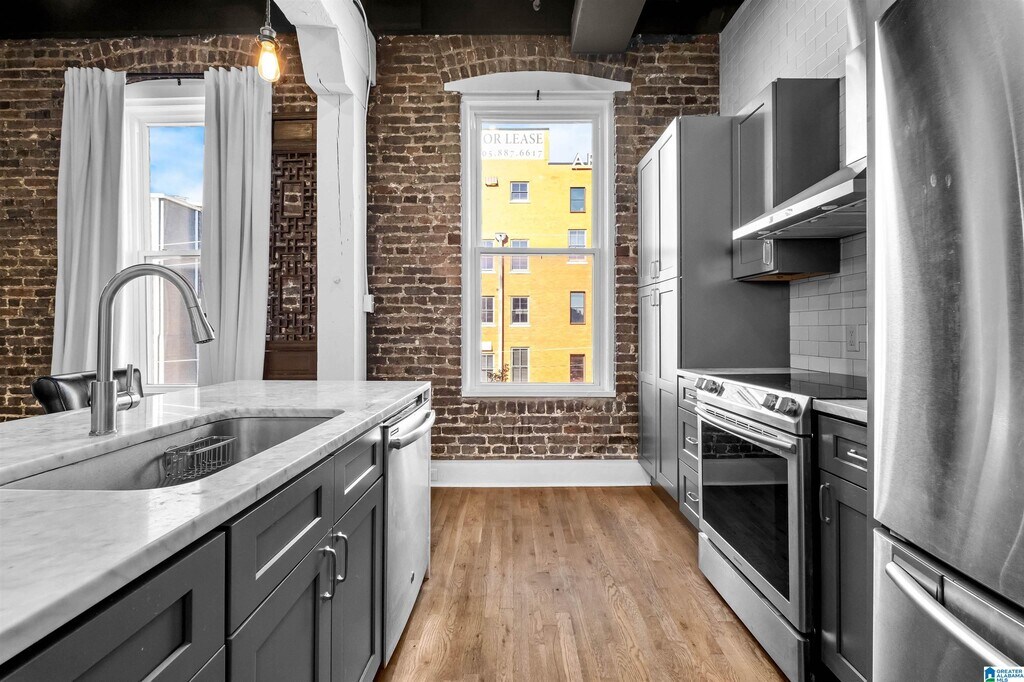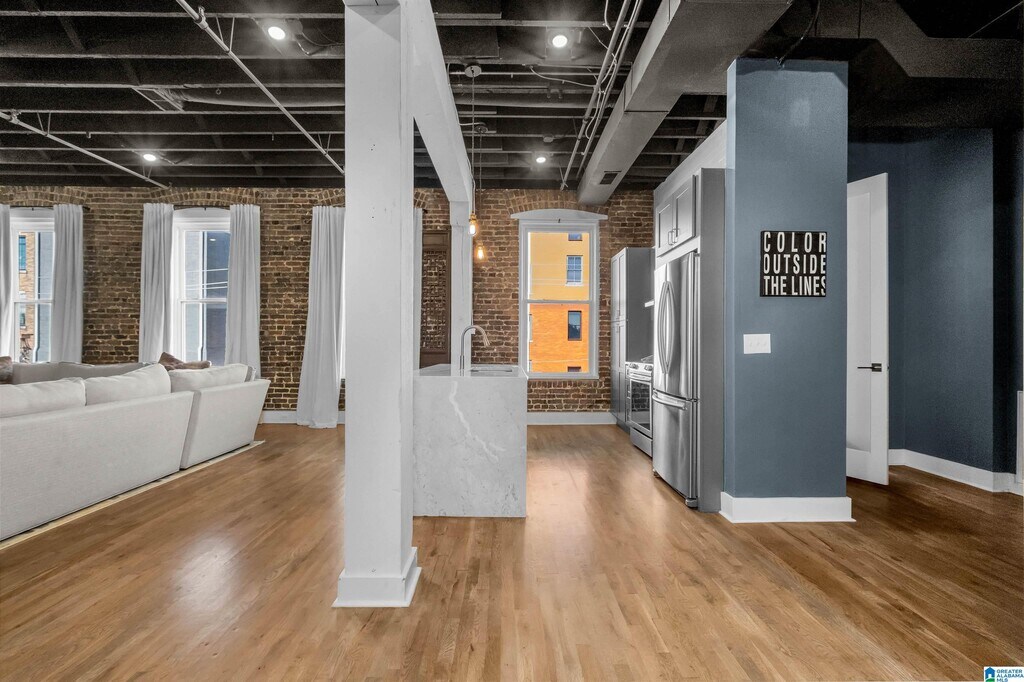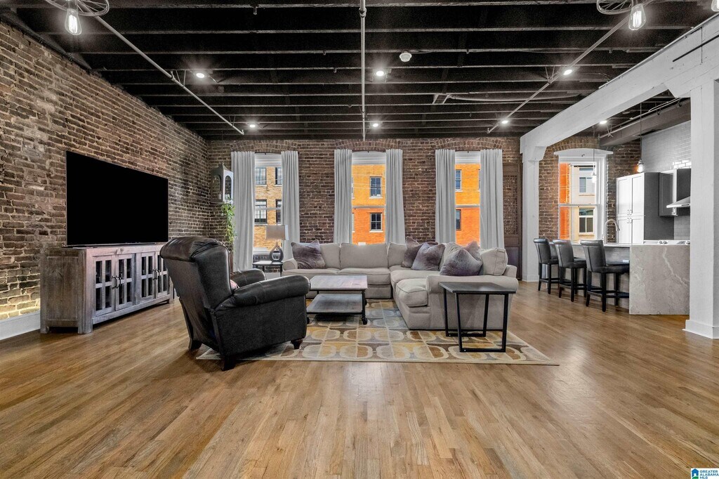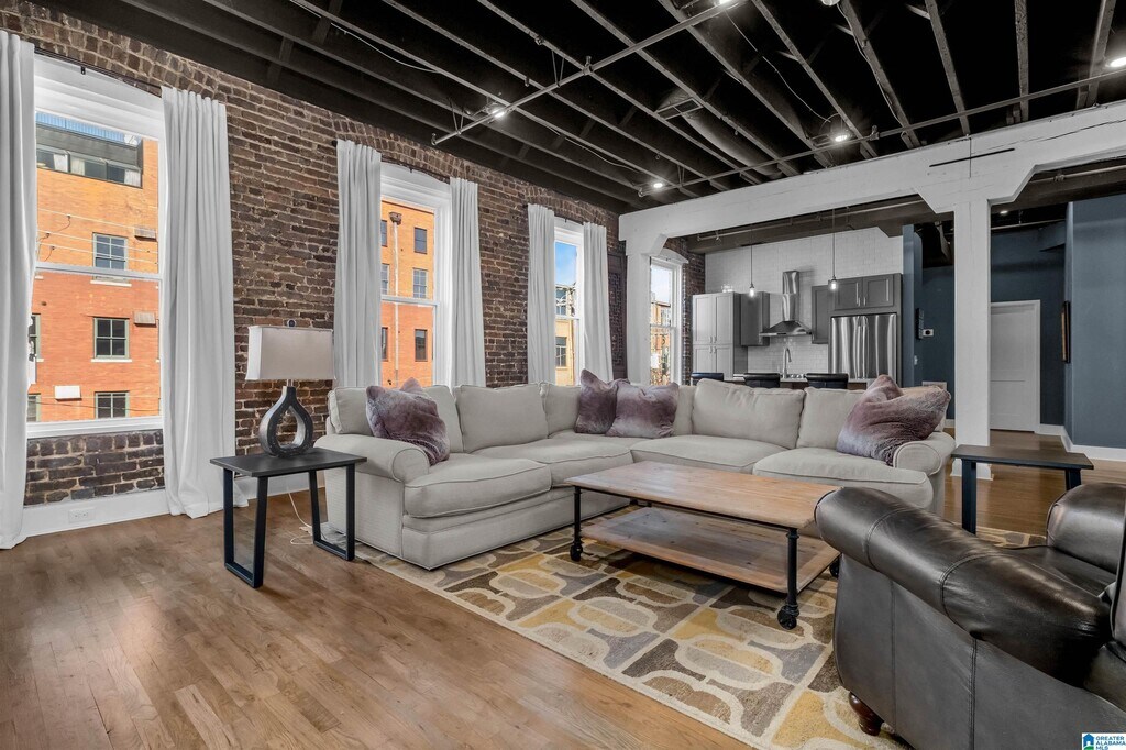 Nestled in the heart of Birmingham’s historic Morris Avenue, this stunning two-bedroom, one-bath loft perfectly blends urban charm with modern updates. Housed in the iconic Standard Sales Building, this residence is the epitome of downtown loft character, featuring soaring ceilings and rustic wooden beams that evoke the building's industrial past. Step inside to find warm, exposed brick walls that add texture and timeless appeal to the space. The open-concept layout is perfect for entertaining, flowing seamlessly from the living area to the fully updated kitchen, which boasts sleek quartz countertops, stainless steel appliances, and custom cabinetry. The bathroom is a serene retreat, showcasing a beautifully modern free-standing tub, a walk-in shower with subway tile, and updated fixtures that merge elegance with function. Both bedrooms offer cozy retreats, and the space is filled with natural light streaming through oversized windows.