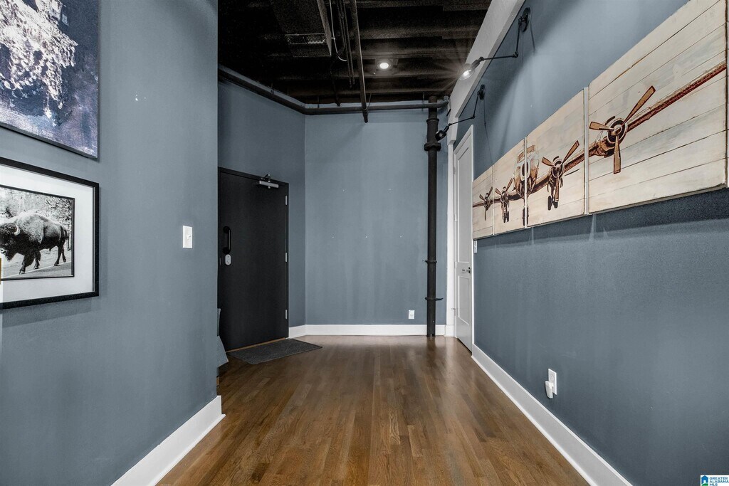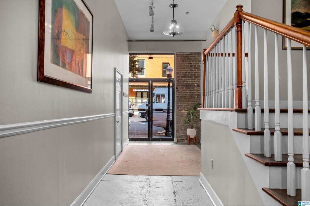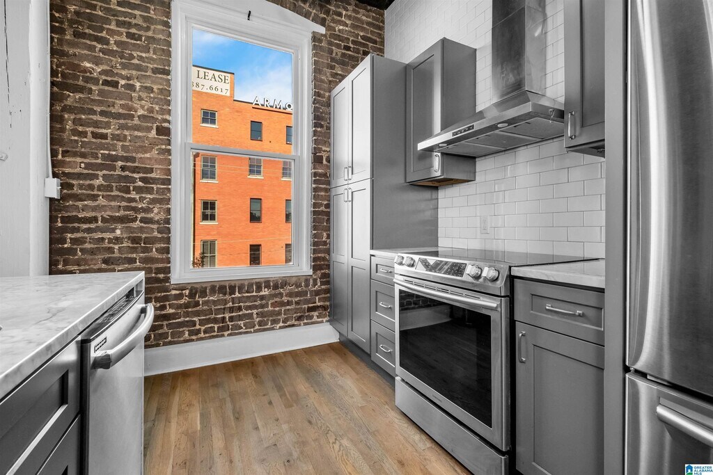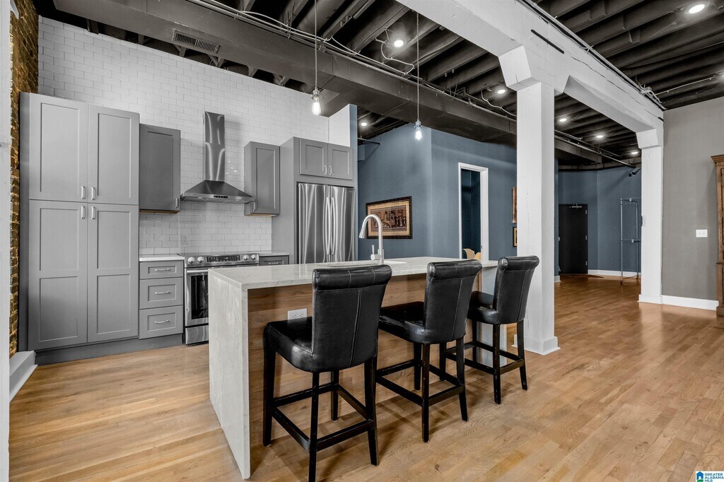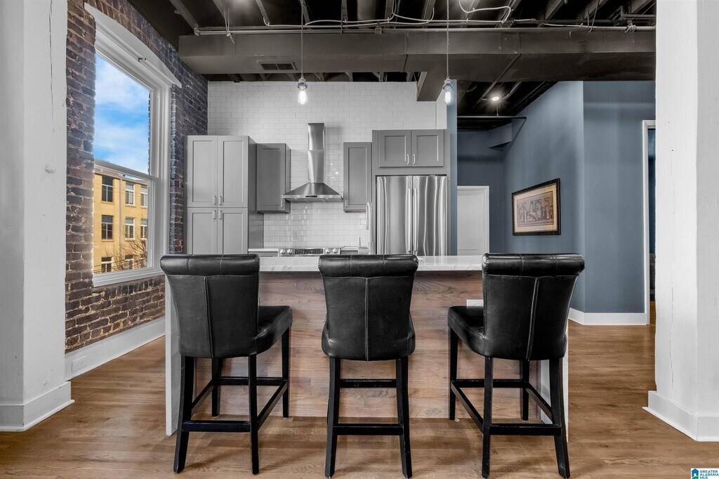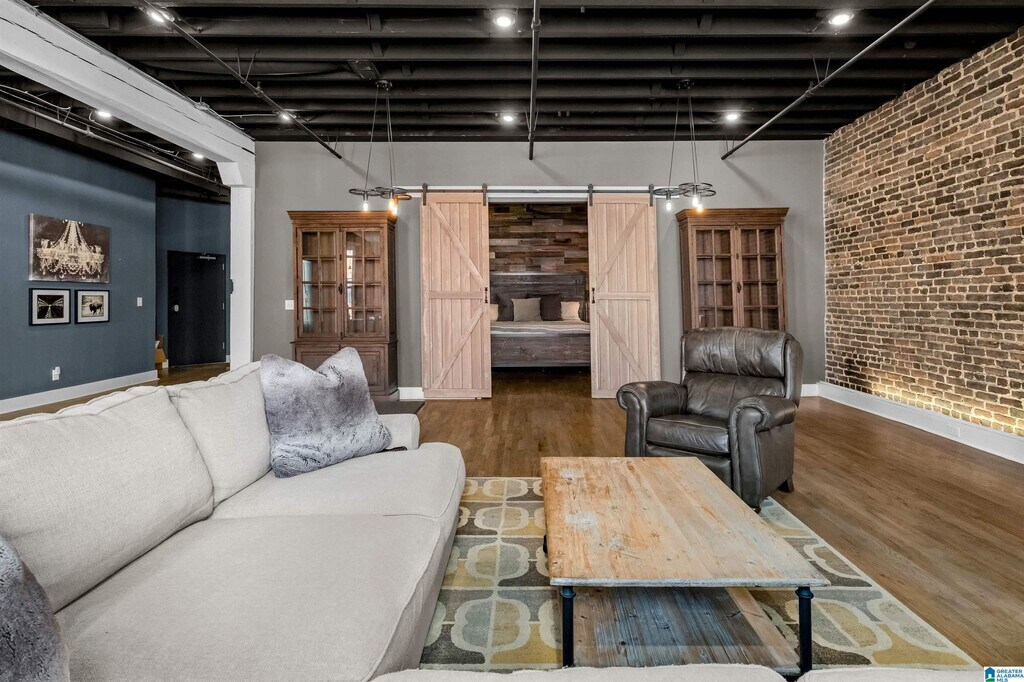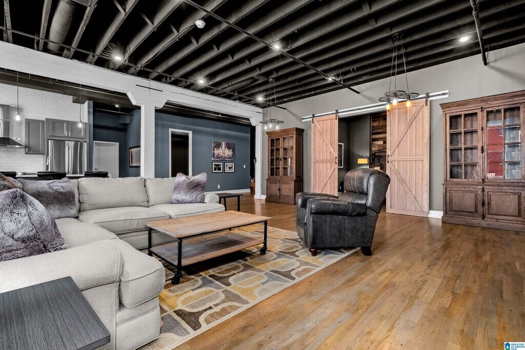 Nestled in the heart of Birmingham’s historic Morris Avenue, this stunning two-bedroom, one-bath loft perfectly blends urban charm with modern updates. Housed in the iconic Standard Sales Building, this residence is the epitome of downtown loft character, featuring soaring ceilings and rustic wooden beams that evoke the building's industrial past. Step inside to find warm, exposed brick walls that add texture and timeless appeal to the space. The open-concept layout is perfect for entertaining, flowing seamlessly from the living area to the fully updated kitchen, which boasts sleek quartz countertops, stainless steel appliances, and custom cabinetry. The bathroom is a serene retreat, showcasing a beautifully modern free-standing tub, a walk-in shower with subway tile, and updated fixtures that merge elegance with function. Both bedrooms offer cozy retreats, and the space is filled with natural light streaming through oversized windows.