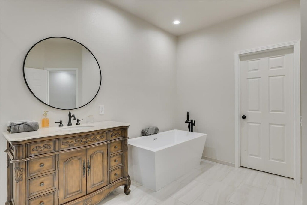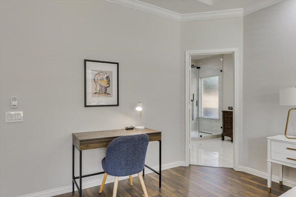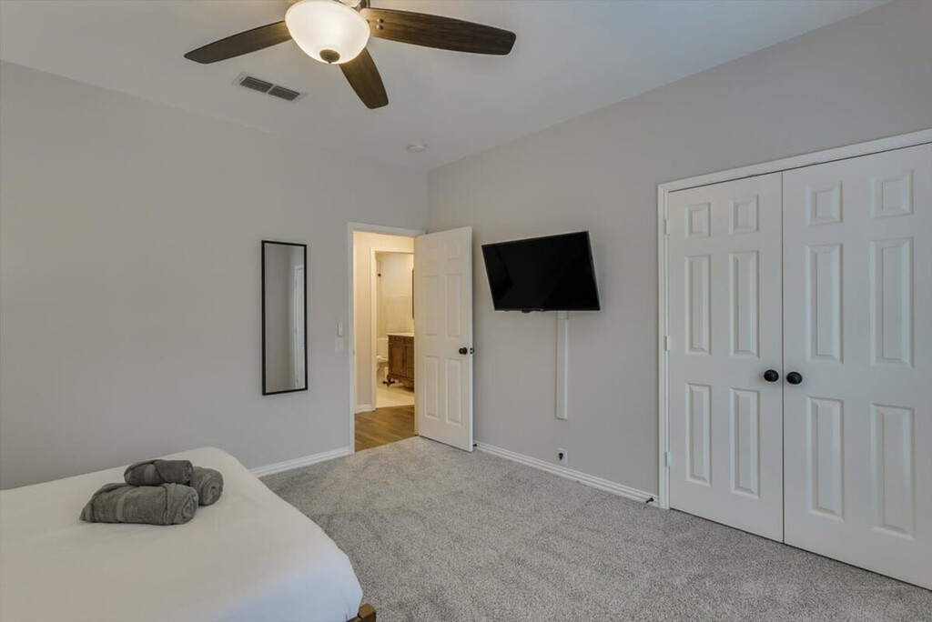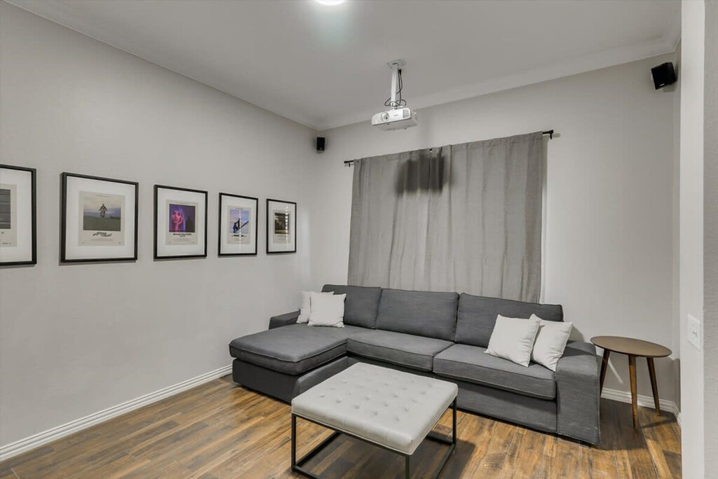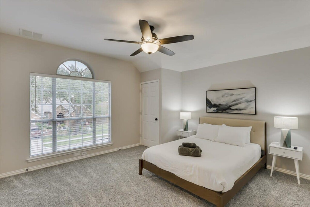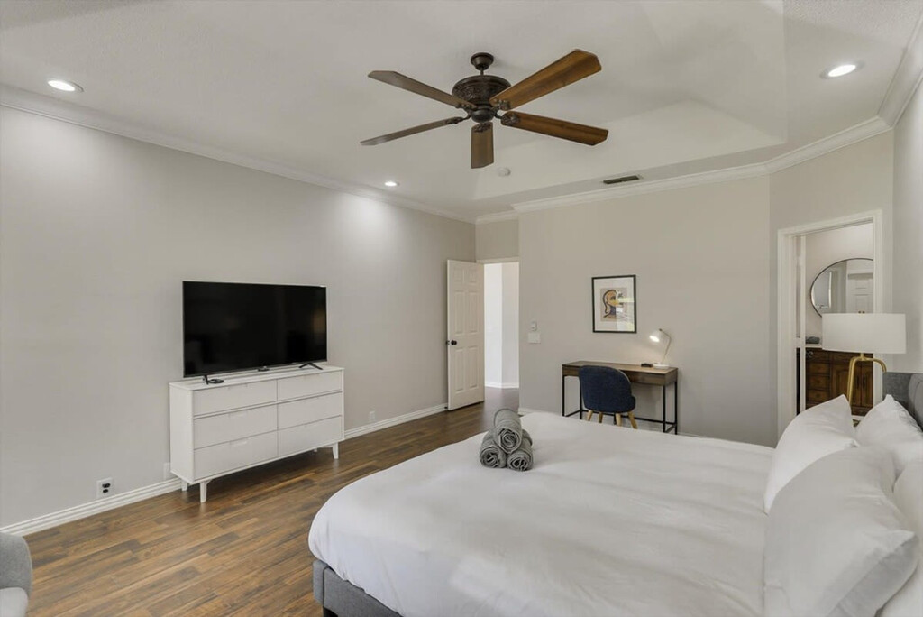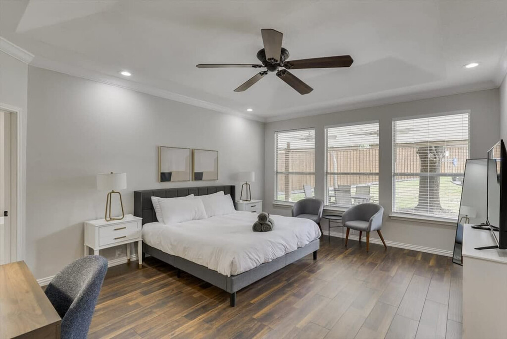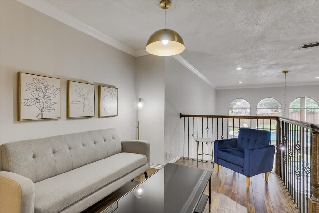 Unwind at this beautiful 5-bedroom, 2.5-bathroom home in Grand Prairie, Texas. Your accommodations can make or break your trip, but you can rest assured that this home will have everything you’re looking for. Space, comfort, beauty, a fully equipped kitchen, movie room, and even a massive pool in the gorgeous backyard await you. Make lasting memories with your family and friends and feel at home in this welcoming space. This home caters to both short-term and medium-term stays, making it an excellent choice for corporate housing needs. Whether you find yourself temporarily displaced from your home or require accommodations for your team during an extended project in the area, this property provides a welcoming and comfortable "home away from home" experience. From the moment you pull up to the grand brick exterior with a sprawling front lawn, you’ll know you made a great choice. Park your cars in the garage away from the sun. Inside, the space is updated with gorgeous flooring and great finishes. Enter into the stunning entryway with high ceilings and a staircase leading to the upper floor. The space is very open with great flow, and the large windows let in tons of natural light. As you enter the living room, you will love the view into your private backyard through the stunning windows. This room also has high ceilings creating a light atmosphere. Enjoy hanging out in this space among the cozy furniture, beautiful décor, and gas fireplace. There’s also a bonus living area on the second floor providing another great spot to kick back and relax. Plus, you’ll even have an awesome cinema room with framed contemporary movie posters and comfy seating. Right off the main living room, head into the large, fully loaded kitchen where you’ll find everything you need to cook and enjoy a delicious meal. It’s equipped with stainless steel appliances, and the gorgeous granite counters offer lots of space. Bask in all the natural light coming in through the large windows as you enjoy your meal in the breakfast area with great views of the backyard, or have your meals in the lovely formal dining area around the large table. There are 5 spacious bedrooms, each with great furniture, lavish bedding, and stunning décor and accessories. The 2.5 bathrooms are clean and nicely updated, with both full baths featuring double vanities and impressive walk-in showers, as well as a soaking tub in the master bathroom. Lastly, spend time in your own private backyard paradise. The oversized covered patio has surround sound, two fans, and a dining set perfect for enjoying your meals outdoors. There’s also lots of green space, a relaxing hammock, and a large pool. Lounge poolside on the chairs and take a dip in the pool. Pets are welcome with a non-refundable pet fee of $150 per pet, with a maximum of 2 pets per stay. Parking is available for 2 cars in the garage and 2 cars in the driveway. An additional nightly rate applies for more than 6 guests, with a $29/night fee for each additional guest. Conveniently located in Grand Prairie, this vacation home is just 13 minutes away from DFW Airport, 20 minutes to downtown Dallas, and 25 minutes to downtown Fort Worth. You’ll have easy access to both cities on either side. Drive about 20 minutes to reach Mountain Creek Lake, while Lake Arlington is 20 minutes away. Situated right in the center of it all, you’re close to many amazing attractions in Dallas and Fort Worth, as well as several great family attractions in Grand Prairie. Shop at the Grand Prairie Premium Outlets just 13 minutes away, enjoy Epic Waters Indoor Waterpark 10 minutes away, and during the holiday season, the Prairie Lights display is a must-see, just under 20 minutes away. Check out The Theatre at Grand Prairie, Ripley’s Believe It or Not Museum, and AT&T Stadium, all less than 15 minutes away. You’re also a short drive from Six Flags Over Texas. There’s no shortage of fun activities to fill your days. Smoking of any type is not allowed, and violations are subject to a $450 fine plus the cost to clean, deodorize, and repair damages. Check-in is at 4pm and check-out is at 10am. No parties or large gatherings are allowed, and only registered guests are permitted on the property. The spa heating element and jets are inoperable. The fireplace is gas operated, and guests should only use it if familiar with its operation, doing so at their own risk and not leaving it unattended. Noise level monitoring is in place to comply with local noise ordinances and prevent unauthorized parties. Room #5 will be opened for groups of 12 or more guests. Pet cleaning fees apply, and pets should be kept off beds and furniture. A full disclosure policy for the number of people on the property is in place, with security camera verification to comply with local laws. Rest assured, no cameras are in any inside private areas, respecting the privacy of guests. Small low-key gatherings are allowed only upon request and approval in advance. A remote work-friendly environment is provided with Wi-Fi and comfortable seating areas, ensuring you can work efficiently during your stay. Registration Number: STR24-00086 [SI]