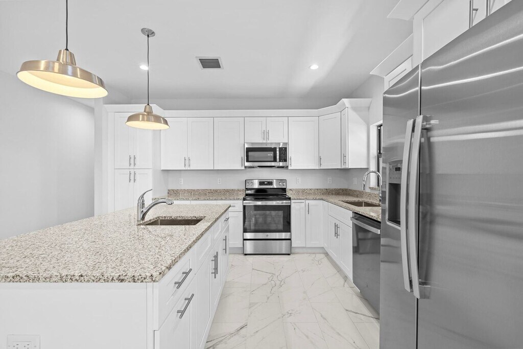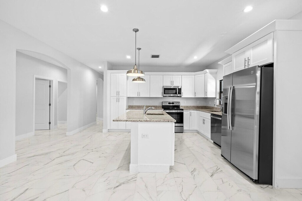 Courtesy of The Bella Group Real Estate, LLC. Be the first to occupy this stunning 2024 new construction home in East Delray Beach, just minutes from downtown with shopping, dining, and entertainment at your doorstep. This thoughtfully designed 3 bedroom, 2.5 bath home features beautiful tile flooring throughout, elegant architectural arches, and an open, airy layout filled with natural light. Gorgeous white kitchen boasts a large center island with pendant lighting, ample cabinetry, and plenty of storage, flowing seamlessly into the living and dining areas. Enjoy a spacious primary suite with a spa-inspired bathroom featuring a tub and walk-in shower. A full-size laundry room with sink, and a two-car garage. Beautiful landscaping completes this modern, bright, and perfectly located home. No HOA- Quick Approval. Come tour today.