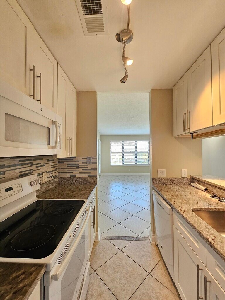 Bright and beautifully remodeled 2BR/1BA unit featuring vaulted ceilings and tons of natural light! Enjoy tile flooring in the main living areas and laminate in the bedrooms. Spacious primary suite offers a large walk-in closet. Updated kitchen boasts newer countertops,cabinetry,and stylish tile backsplash. Renovated bathroom with modern vanity,fixtures,and tile. Full-size washer & dryer in unit plus exceptional storage with multiple closets throughout. Relax on the screened,tiled patio overlooking a peaceful canal view,complete with additional storage. Situated in a fully renovated community with freshly painted buildings and a modern new look. Impact windows throughout provide added safety,efficiency,and peace of mind. MLS ID B26016674