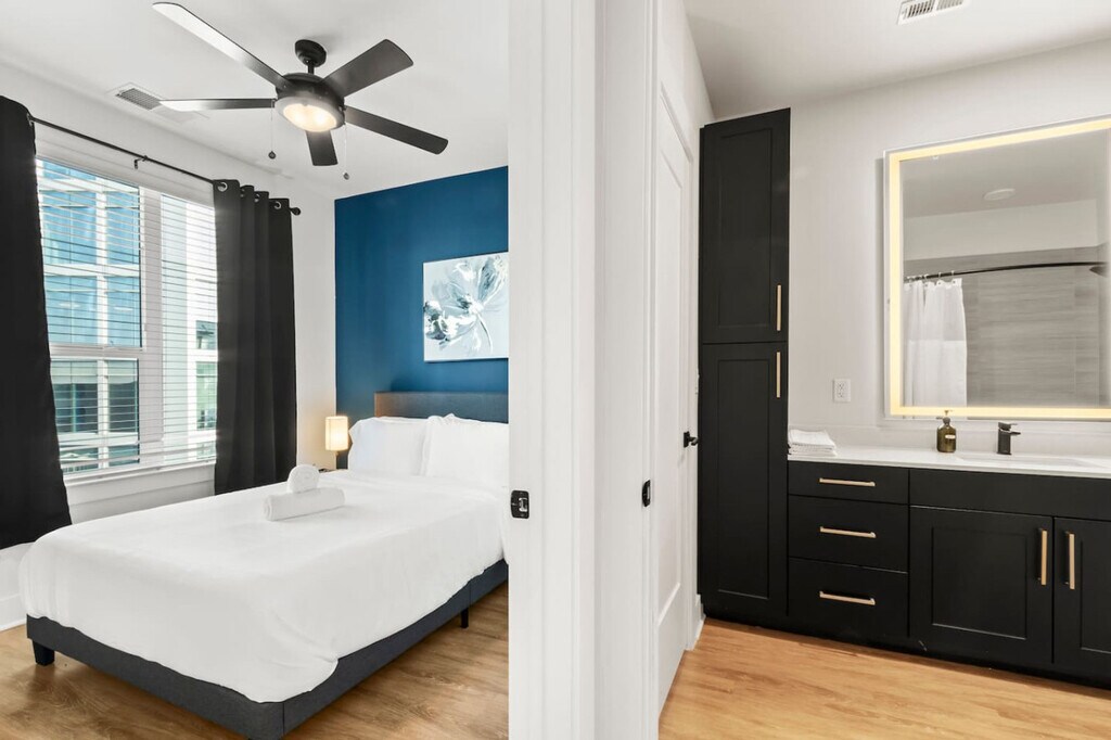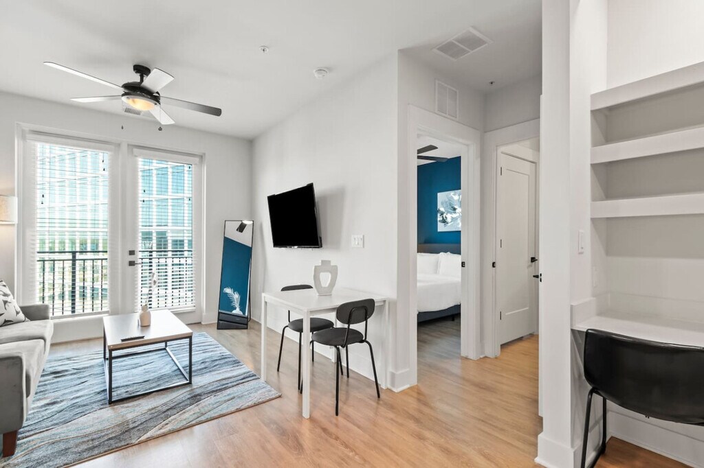 Feel at home in this amazing studio in Tampa, perfect for your business trip. Enjoy a quick ride to the beach or downtown from this perfectly located apartment, featuring a luxury Nectar Queen Bed for a good night's sleep. The studio offers a peaceful and quiet space to relax, with brand new amenities, awesome courtyards, a pool, and a gym. The combined living and dining area is furnished with LED lighting and modern furniture, creating a private oasis to relax. Plenty of natural light illuminates the space, complemented by wooden floors and finishes for a pleasant and modern ambiance. The kitchen is equipped with all the essentials to cook your favorite meals, and in-unit laundry is available for your convenience. Free parking is available for guests. A pet cleaning fee of $45 per pet applies, with a weight limit of 35 lbs and restrictions on certain breeds. Early check-in and late check-out are available for a fee, subject to availability. A $100 fee applies for a missing keyfob. Minutes away from Downtown Tampa, this studio offers convenient access to major roads and highways. Enjoy nearby attractions such as Raymond James Stadium, Amalie Arena, and a variety of dining options within walking distance. Beaches like Ben T Davis Beach and Madeira Beach are just a short drive away, making it easy to explore all that Tampa has to offer. Smoking is prohibited and will result in a $500 fine. No parties are allowed, with violations resulting in a $1,000 fine and immediate eviction with no refund. A noise curfew is in place from 10 PM to 7 AM on weekdays and 10 PM to 8 AM on weekends, with penalties for violations. Self-check-in and check-out are available via smart lock. Guests must be 21+ to book a reservation, and no entry is allowed for unregistered guests. The apartment is equipped with Minut Noise Detectors to monitor noise levels, and surveillance cameras are present in common areas. Stay connected with free high-speed Wi-Fi offering up to 1GBPS upload and download speeds. A 50" HD Smart TV is available for entertainment, and the apartment features AC and heating for full temperature control. [SI]