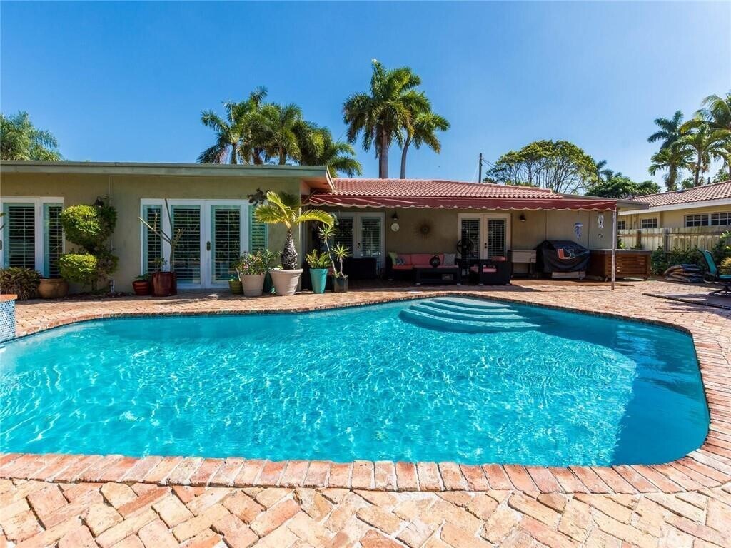 Beautifully renovated 4/3 mid-century waterfront pool home in a prime location! Offered unfurnished,this sprawling ranch has it allover 3,100+ square feet of living space. The split bedroom plan features two primary suites with ensuites,plus two additional guest bedrooms. The home exudes charm from the moment you enter through the gated front courtyard. A formal foyer opens to a spectacular great room showcasing a stylish modern kitchen with waterfall countertops,breakfast bar,and newer appliances. Additional highlights include formal dining,an eat-in kitchen,and a light-filled living room surrounded by windows on three sides overlooking the heated pool and spa. Enjoy outdoor living with a covered patio,60 feet of waterfront,a thatched-roof tiki hut,and a two-tiered dock. All complemented by a Chicago brick paver patio. Laundry room,large pantry,and attached two-car garage complete the home. MLS ID B26014668