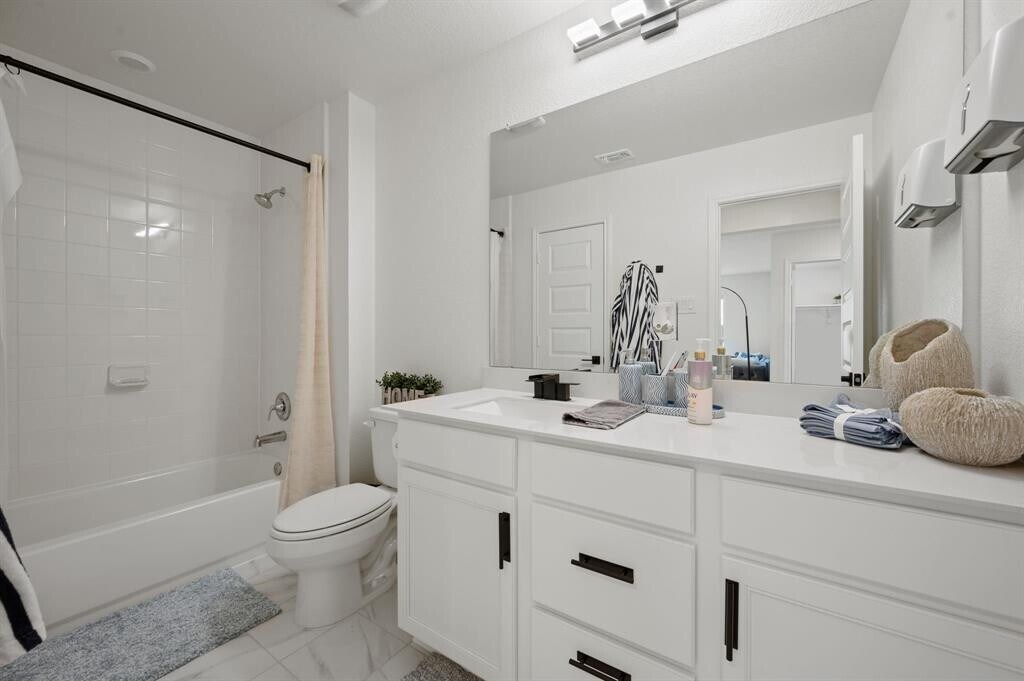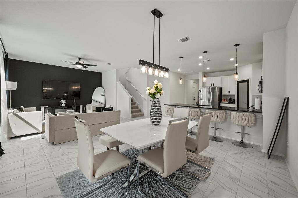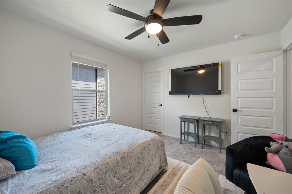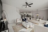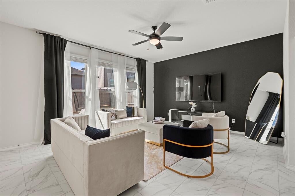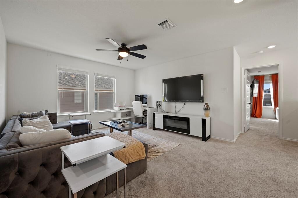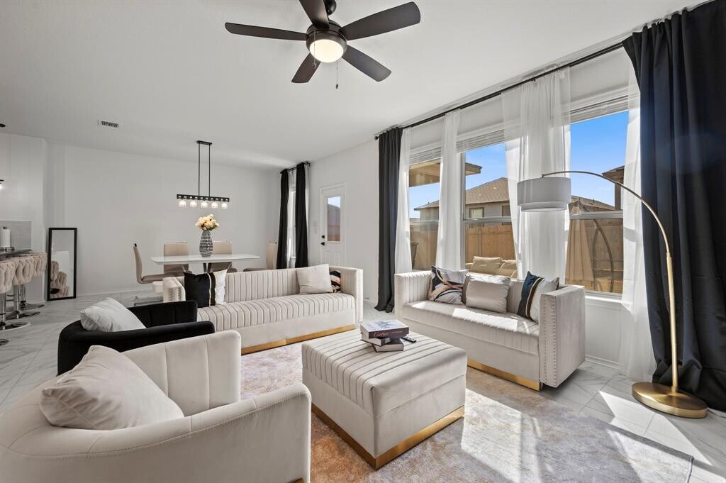 This beautifully designed two-story home offers 4 spacious bedrooms and 3.5 baths, blending comfort and modern style throughout. The main level features a private bedroom with a full bath, ideal for guests or multigenerational living, while the second floor offers three additional bedrooms and two full baths for family and friends. Soaring ceilings and expansive windows fill the open-concept living area with natural light, seamlessly connecting the living room, dining space, and kitchen. The chef-inspired kitchen includes sleek finishes, a breakfast bar, and a pantry, creating both function and style. Tile flooring on the main level ensures durability and easy maintenance, while upgraded lighting and plumbing fixtures add a touch of elegance. Upstairs, a versatile loft game room offers the perfect space for recreation or relaxation. The large laundry/utility room provides convenience and storage. Step outside to a sunny, level backyard with a covered, extended patio featuring a ceiling fan, designed for year-round enjoyment whether hosting friends or simply relaxing. A 2-car garage and water loop installation complete this home’s thoughtful features. Nestled in a quiet, welcoming neighborhood with easy access to shopping, dining, and entertainment, this move-in-ready property offers the perfect balance of modern design, functionality, and everyday comfort.