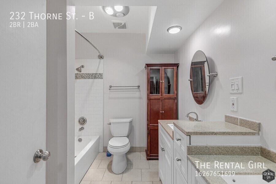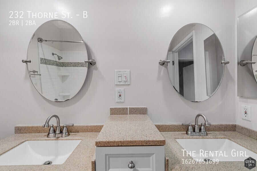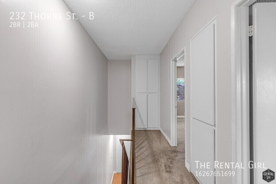 Welcome to 232 Thorne St, Unit B, a charming two-story condo offering comfort, space, and convenience in a small three-unit community. This bright and inviting home features a spacious living area with lots of cabinetry, a modern kitchen with gas range, microwave, and dishwasher, plus in-unit laundry for added ease. Upstairs, you’ll find two well-sized bedrooms, each with two closets, as well as a full bathroom boasting a dual vanity and shower/tub combo. Warm carpeted floors upstairs and built-in hall storage add to the home’s cozy, functional appeal. Step outside to your front yard area, with potential for additional outdoor space. A 2-car tandem covered parking setup makes city parking simple. Enjoy the comfort of central air and heat, ceiling fans, and a pet-friendly policy allowing two small pets with an additional deposit. This home combines convenience, comfort, and privacy in a well-maintained complex — perfect for those seeking a quiet, updated space with easy access to local amenities.