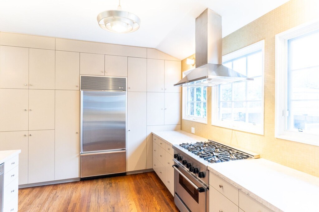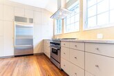 Traditional 1940's 2b2b home on quite Beachwood Canyon Street with modern touches through out. Home was completely transformed in remodel which was featured in multiple design magazines. Tranquil entryway leads to an open concept living room dinging room with green views, fireplace and warm-tone hardwood flooring. Kitchen is flooded with natural light and has built in Sub-Zero refrigerator, 36" Thermador range custom low profile cabinetry and laundry closet. Upper level comprises bedroom ( or office) w/ small patio, remodeled shared bath and primary suite with gorgeous 3/4 bath with teak cabinets and skylight illuminated oversized shower. Out door spaces are lush, cozy and private. Central HVAC - Two car garage. One year lease. Tenant pays utilities. Deposit of one months rent on approved credit. Pet ok with owner approval.