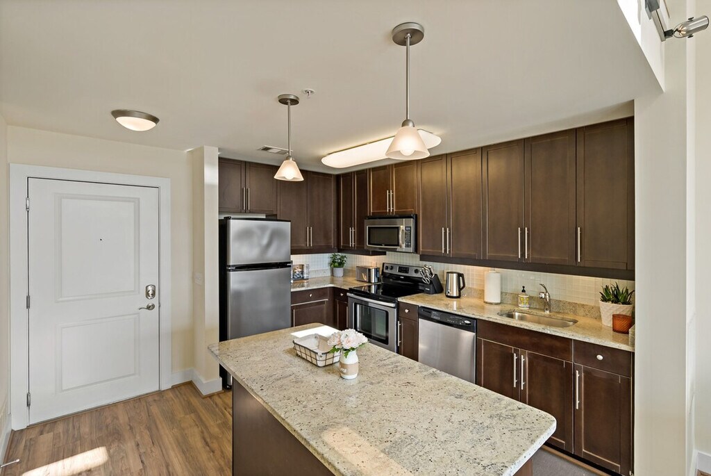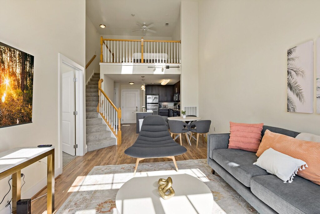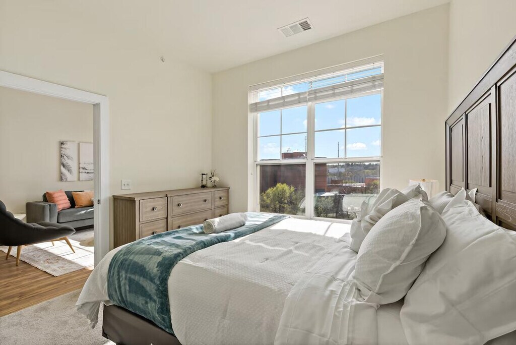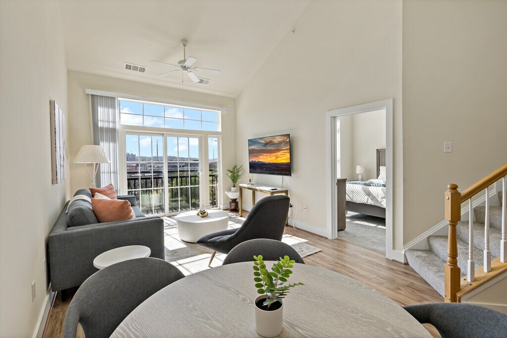 Experience urban living and feel at home in this stylish loft located in the heart of Alexandria, just minutes from Old Town's shops and restaurants. This space offers a unique blend of modern design and historical charm. The apartment features two spacious bedrooms, each furnished with a plush queen-size bed, cozy bedding, and ample storage space. The full bathroom includes a shower/tub combo and fresh towels. The fully equipped kitchen features stainless steel appliances, cookware, dishware, and essentials like a coffee maker and toaster. A dedicated dining area with a table and chairs is perfect for enjoying meals or getting some work done. The stylish and comfortable living space has a smart TV, high-speed Wi-Fi, and a relaxing atmosphere. An in-unit washer and dryer are available for your laundry needs. Building amenities include a pool, a gym, and a lounge with a pool table. Shared work areas are also available. Paid garage parking is available in the building’s garage for $30 per vehicle per night or $350 per month and must be arranged in advance. Pets are welcome for $25 per pet per night or $350 per month; please contact me before booking. Centrally located near shops, restaurants, and public transportation, making it easy to explore the city. A deposit is required for extra keys. [SI]
