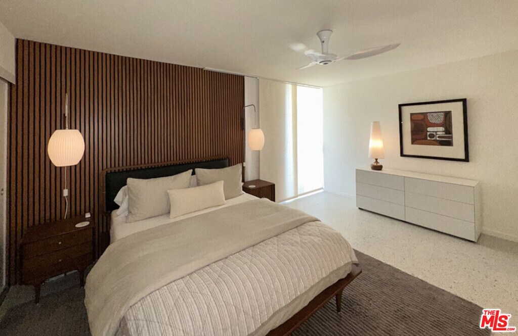This unit is booked for Jan/Feb 2026. Kick back and relax in this calm, stylish space. Designed by William Krisel, the condo captures the spirit of the Sixties with breeze blocks, globe lights, and bright orange accents. 30 day + rentals only. Rare Mid-Century Modern Condo in Iconic Canyon View Estates, Palm Springs. Live in one of Palm Springs' most coveted mid-century modern communities! This stunning end-unit condo, located in the prestigious Canyon View Estates, offers the perfect blend of classic design, privacy, and panoramic desert views. Designed by renowned architect William Krisel, this rare unit is one of only eight with a distinctive level roof and prime end-unit location. Inside, you'll find bright, open living spaces filled with natural light, thanks to dramatic clerestory windows that stretch along the entire southern side especially highlighting the kitchen. The spacious living area flows seamlessly to a private back patio through large sliding glass doors, framing breathtaking views of the Andreas Hills. Original mid-century details have been lovingly preserved, including vintage tile work in both bathrooms and sleek built-in cabinetry throughout. Enjoy ample storage, clean architectural lines, and the timeless charm that defines Palm Springs style. Whether you're relaxing on the patio or entertaining in this one-of-a-kind space, you'll be surrounded by the beauty and history of true mid-century design. Highlights: New terrazzo tile floors throughout the unit and patios, End unit with enhanced privacy, Clerestory windows throughout the living room and kitchen, Floor-to-ceiling living room windows leading to the patio, Vintage mid-century details throughout, Stunning mountain views, Community pool and spa, Lush landscaping, Prime location in South Palm Springs. Don't miss this opportunity to rent a piece of Palm Springs architectural history! Rental rates: Off Season (June -Aug) - $3500 Shoulder Season (Sept, Oct, Nov, May) $4000 Peak Season (Dec, Jan, Feb, Mar, April) $4600 PLUS cleaning fee. Utilities included. Electricity included up to $350/mo. Overage to be paid by guest. MLS# 25587343