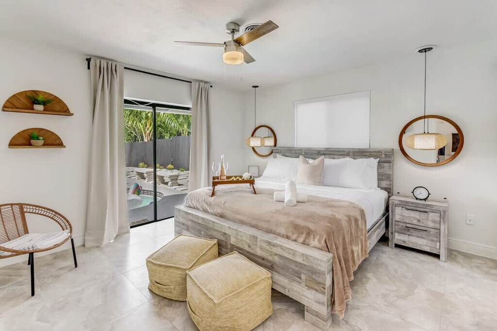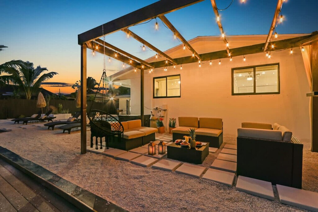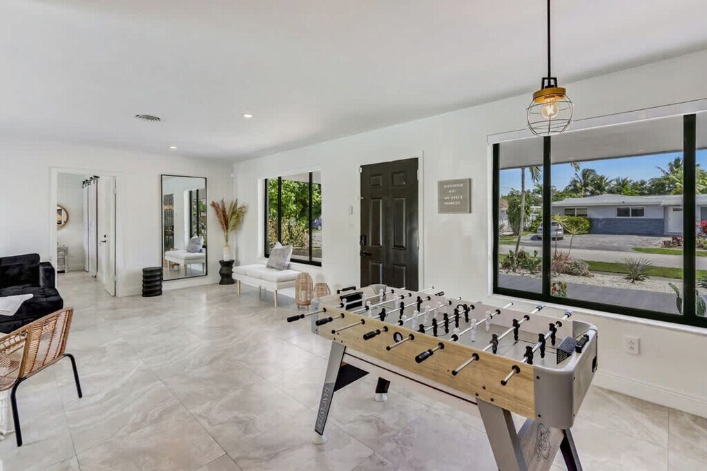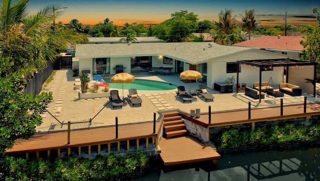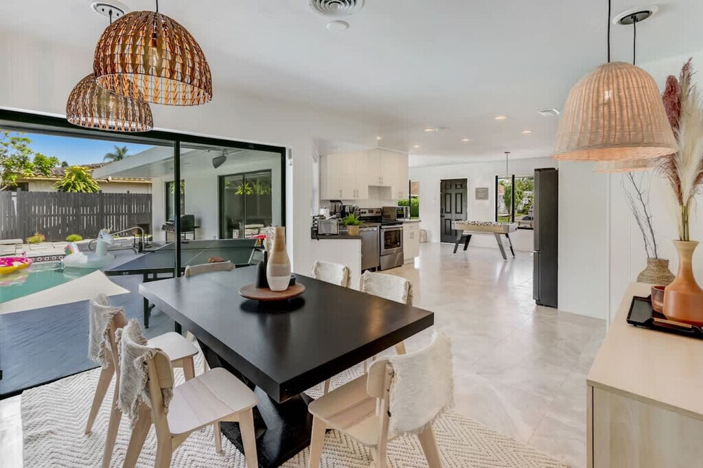 Feel at home in this breathtaking lakefront oasis villa located in the heart of Miami, with a unique setting inspired by a refreshing Wabi Sabi concept. This hidden gem features five bedrooms, two bathrooms, a heated pool, arcade games, pool games, a gazebo with lights, free parking for three vehicles, and high-speed internet (800Mbps). If you'd like to have the pool heated during your stay, please let me know at least 48 hours in advance for $50 per day. This is a pet-friendly property; please enter how many pets you are bringing with you before booking. Located in an upscale and safe area of Miami, this villa is surrounded by lakes and lush greenery. It's close to beautiful beaches and near the Aventura Mall, a premier shopping destination in South Florida, renowned for its luxury shopping and nightlife. The area is family friendly with plenty of activities such as restaurants, golfing, and entertainment. Aventura Mall is a 5-minute drive away, Sunny Isles Beach is a 10-minute drive, Fort Lauderdale Airport (FLL) is a 10-minute drive, Miami International Airport (MIA) is a 20-minute drive, and Brickell is a 20-minute drive. The house is very close to I-95 for easy access throughout South Florida by car and close to the main bus depot for easy bus transportation. Please clean up after using the BBQ; if the grill is not cleaned, an extra $50 cleaning fee might apply. No smoking is allowed inside the house. The landscaper will enter the property for scheduled lawn maintenance every 15 days, and the pool technician will conduct pool maintenance twice a week. Four single double-thick air mattresses can be provided upon request. [SI]