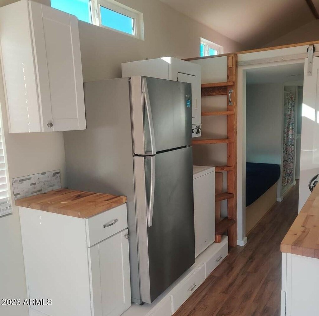300 sq. ft. tiny home for rent,completed in 2024. All utilities included in rent. Full kitchen with full sized fridge,full sized microwave,full sized oven/range. Stackable washer/dryer in unit. Spriral staircase up to a 12' X 8' loft... holds any size bed,Twin sized bed downstairs in bedroom w/ storage underneath. Bathroom includes toilet,single full sized sink and spacious tiled walls shower,instant hot water. Also has clothes closet w/ shoe shelving at far end. Living room with wall TV and installed TV on wall in bedroom. This unit has 2 AC units to keep it cool in the summer. Vaulted 10' ceilings. Plenty of windows. 8' X 10' patio off of front of home. Tenant has parking space for 2 and large private area to use if tenant has pets. No smoking,some other rules apply.