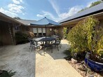 SPECTACULAR & LUXURIOUS! Resort-style pool with dazzling LED color-changing lights, surrounded by elegant travertine flooring. This home boasts updates galore—new windows, roof, gutters, radiant barrier, upgraded insulation, solar panels to cut down on your electric bill and a tankless gas water heater. The gourmet kitchen is a showstopper with a complete renovation featuring high-end stainless steel appliances and custom finishes. Retreat to the luxurious master suite, reimagined with floating quartz cabinets, bespoke closets, and a spa-like bathroom showcasing a Kohler programmable shower system with 11 adjustable heads. Additional highlights include a wood-encased ceilings, a state-of-the-art security system, drip irrigation, soffit lighting, and outdoor speakers. Perfectly blending sophistication and modern convenience, this home is ideal for entertaining and situated in a prime central location. TRULY IMPRESSIVE—A MUST-SEE!