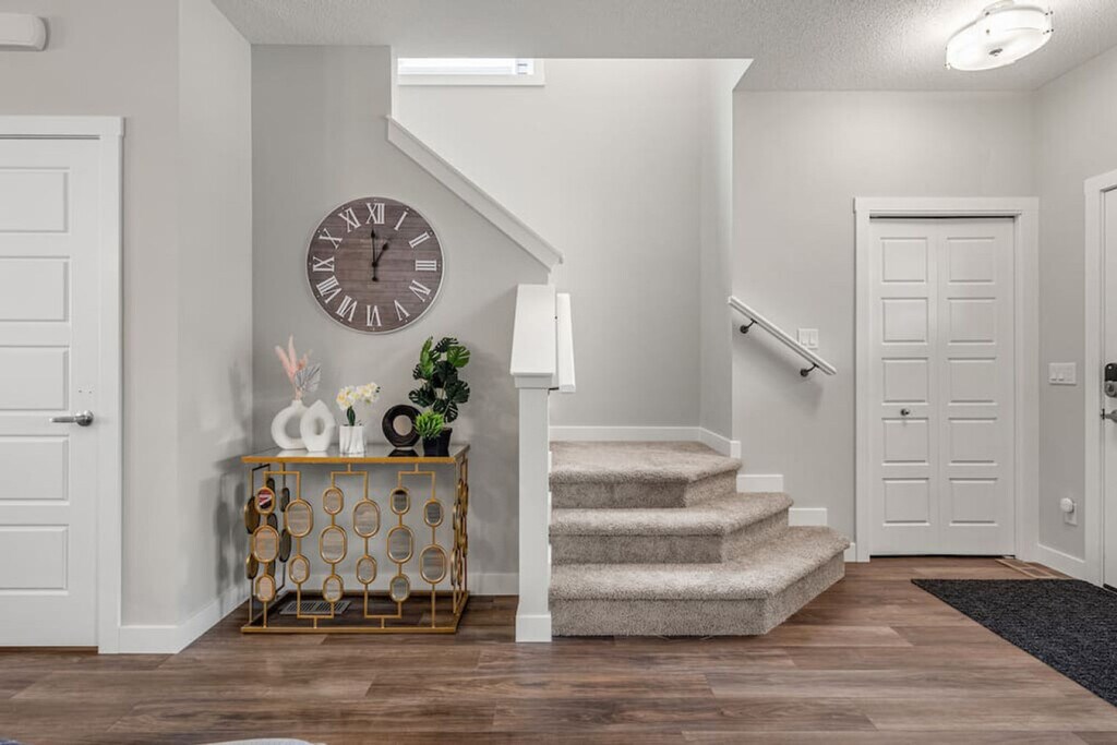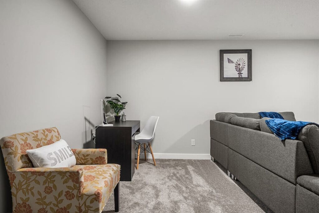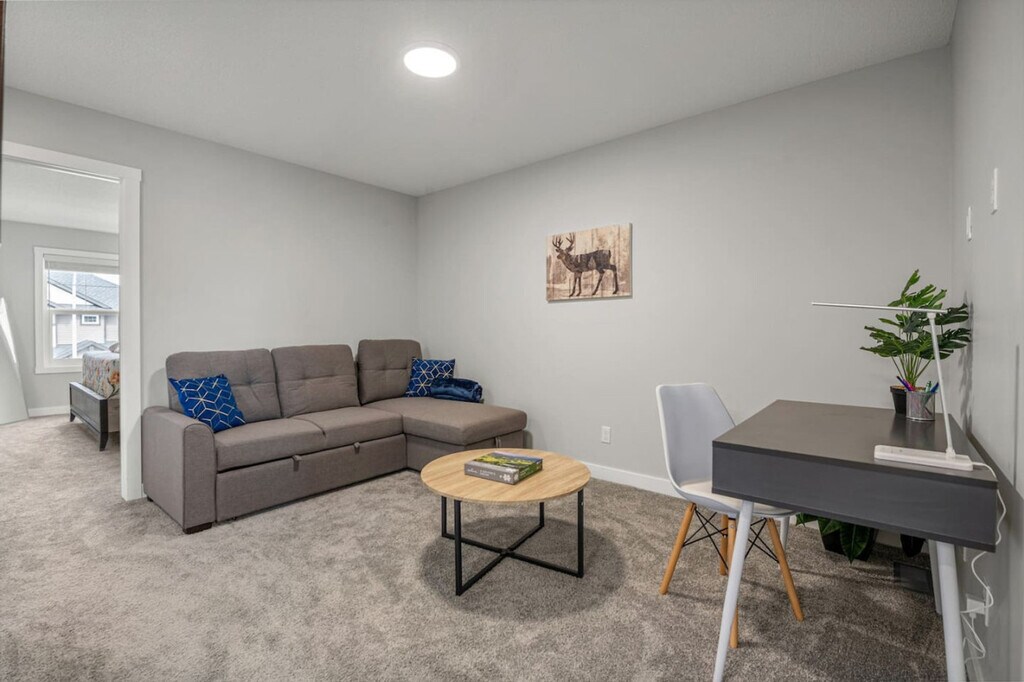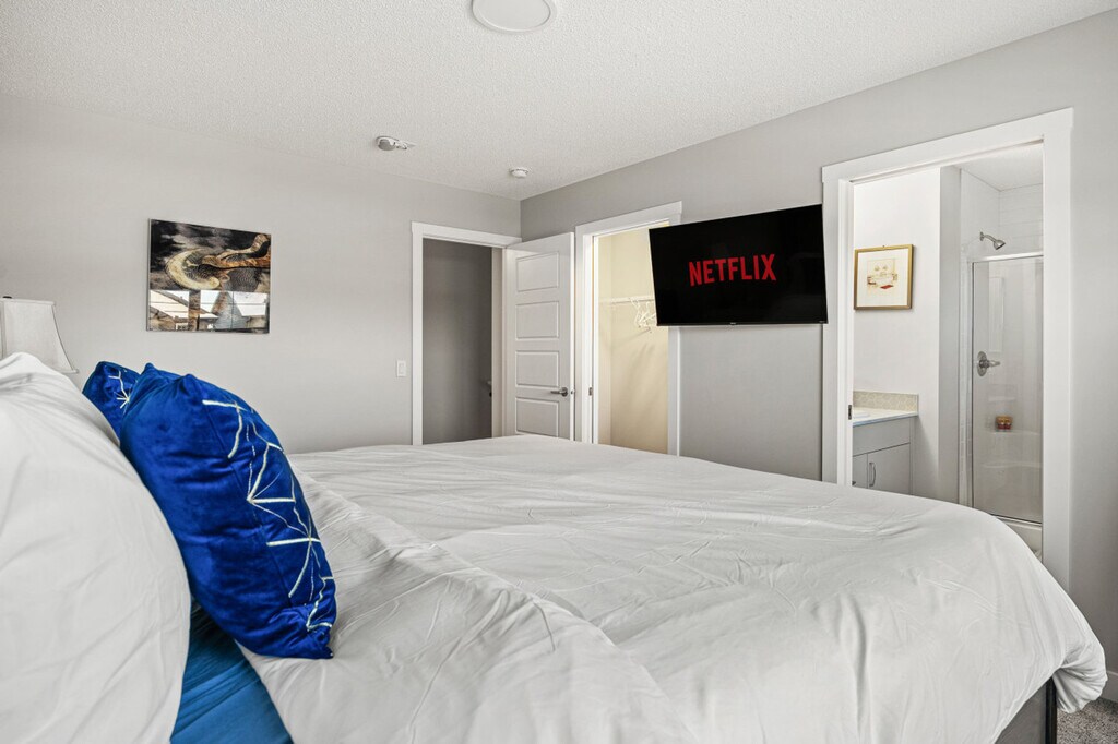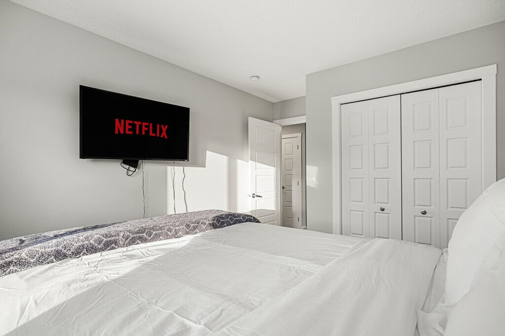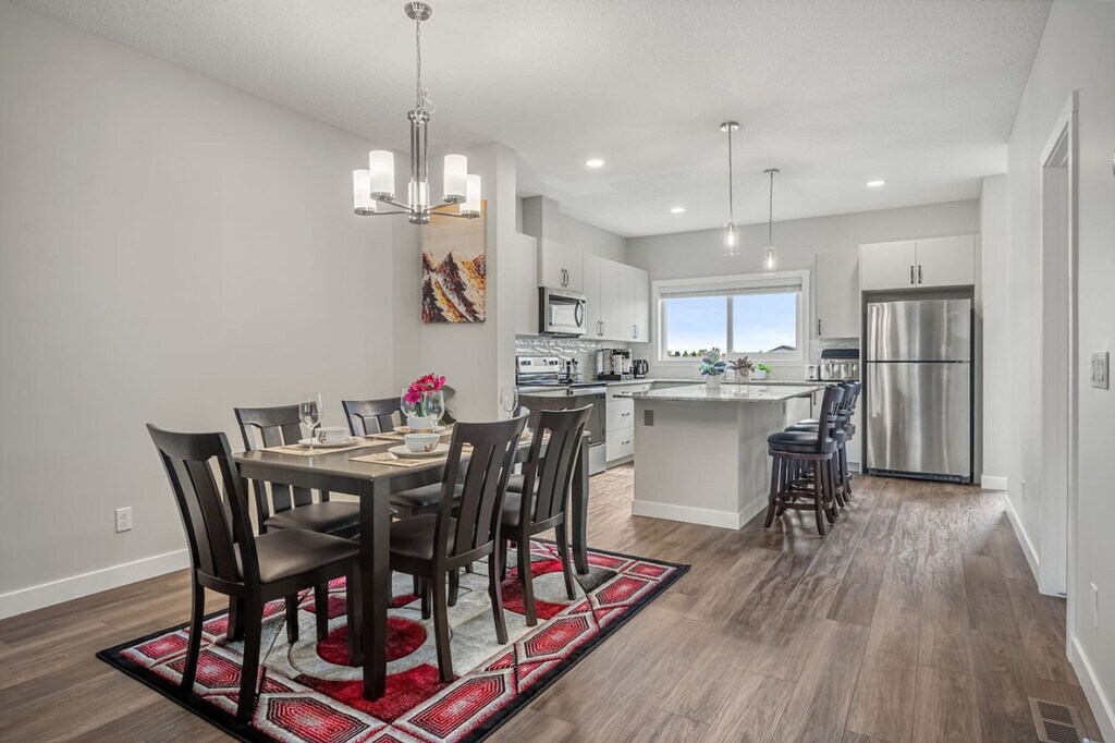 Welcome to this spacious and inviting home in Airdrie, where you and your family can feel at home across the basement, main, and upper floors. This dog-friendly property features two king-size beds with TVs, two queen beds with TVs, and two queen sofa beds, offering ample sleeping arrangements. Enjoy the convenience of a fully equipped kitchen, three full bathrooms, and one half bathroom. With comfy linens and essentials provided, a large parking pad, and street parking, this home ensures a comfortable stay. Stay connected with fast Wi-Fi and a 55” smart TV with Netflix, and enjoy the comfort of heating and air conditioning. The property also includes a washer and dryer, and a patio with a dining area and BBQ grill. The home boasts three living rooms, each with a large sofa bed and linens, sofa sitting areas, and 55" smart TVs with Netflix. The modern and inviting atmosphere is complemented by high-speed internet, board games, and an office/desk work area. The kitchen and dining area feature stainless steel and custom appliances, a 4-burner stove, oven, microwave, refrigerator, freezer, and dishwasher with pods provided. A Keurig coffee maker, toaster, and essentials are included, along with a large dining area on the main floor with island seating and bar stools. Complimentary paper towels, Keurig pods, tea, and Brita are also provided. Enhance your stay with optional upgrades, including a National Park entry upgrade, welcome basket, birthday decor package, romantic wine and flower package, spa at home package, movie night upgrade, Christmas tree and decor, Halloween decor and pumpkin carving package, winter cozy package, beer tasting kit, diffuser and aroma set, additional bedding and sleeping arrangements, grocery pre-stocking service, and a pet-friendly package. These upgrades are subject to availability. Located in Midtown Airdrie, this home offers a walkable neighborhood with scenic walking paths, ponds, and green spaces. While some amenities require a short drive, shops, dining, and services are within close reach. Airdrie Transit provides convenient bus routes, including the Intercity Express (ICE) service to Calgary, making commuting easy. Enjoy Airdrie’s extensive pathway network, perfect for cycling and outdoor activities, with easy access to parks and nearby trails. The property is conveniently located just minutes from major highways, making road trips to Banff, Kananaskis, and Canmore a breeze. The property is professionally managed to ensure top-tier service and a smooth, enjoyable stay, with 24/7 guest support and communication. Full self check-in and check-out are available, with a personalized check-in experience. Guests are provided with a 2-car rear parking pad and free street parking. Detailed check-in and check-out instructions are provided, and the host is always available to address any questions or concerns. The property has a strict no-smoking policy, with a $250 CAD fine for violations. Quiet hours are from 10 pm to 7 am, and there is a strict complaint policy in place. No parties, drugs, excessive drinking, or loud music are allowed, and events for work or meetings are permitted upon request. Unauthorized late check-out will result in an extra night stay or additional fees. Please remove outdoor shoes while in the home. The property includes a dedicated office/desk work area, high-speed internet, and board games, making it remote work-friendly. A laptop computer is not included.