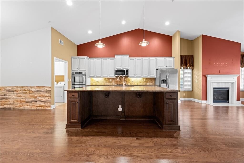 2BR/2.5BA one level living with hardwood floors & high ceilings. Kitchen is spacious,with custom cabinets and upgrades including a double oven,marble backsplash,granite countertops,and large kitchen island. Open floor plan allows for easy entertaining. Master bedroom is oversized,and receives ample sunlight,making the space warm and inviting. Patio overlooks a large & level backyard. Washer,dryer,& refrigerator included!