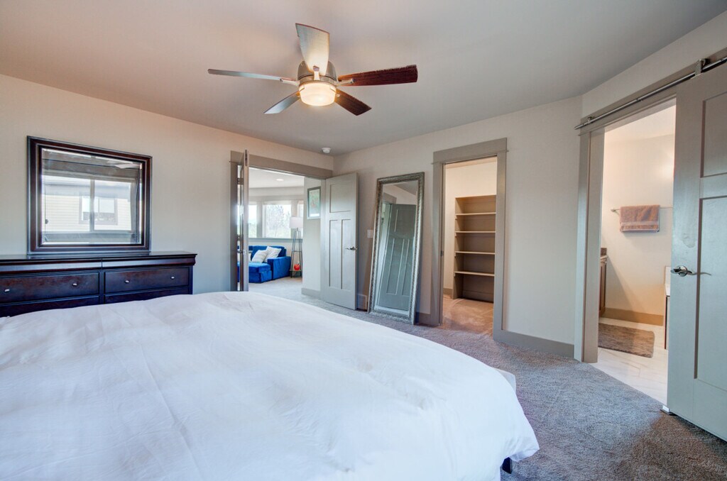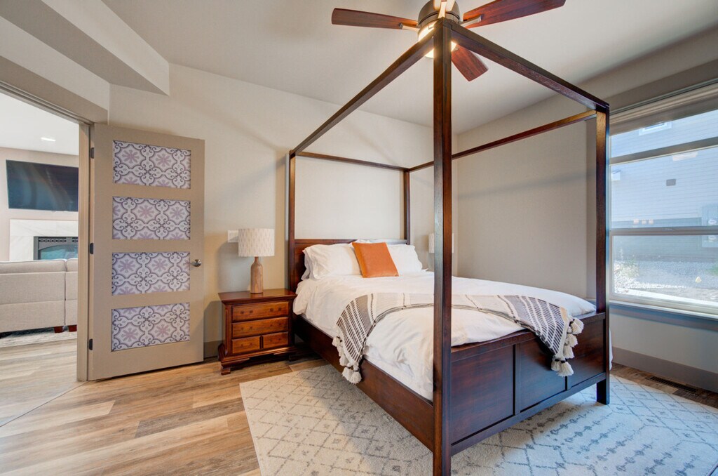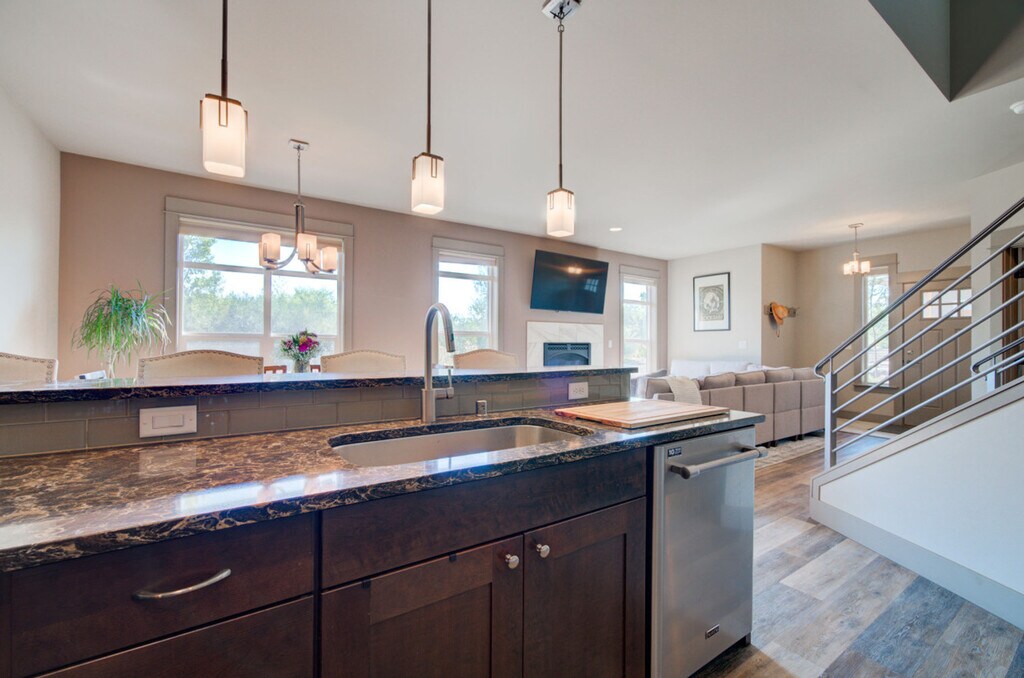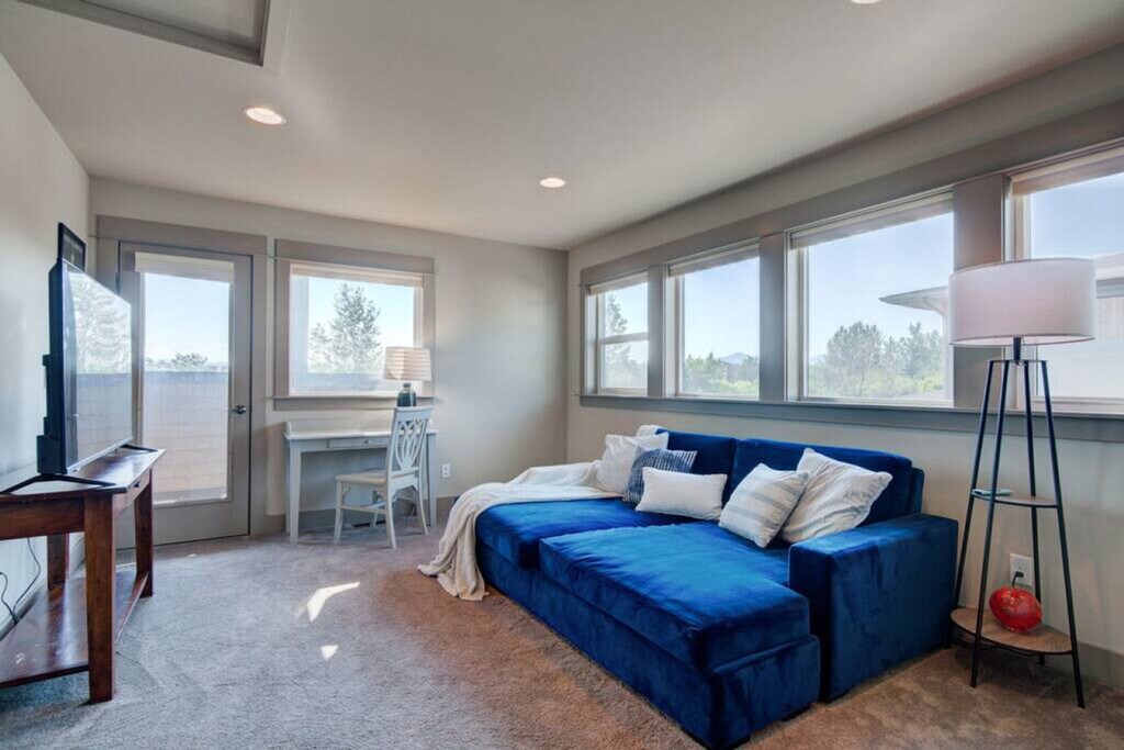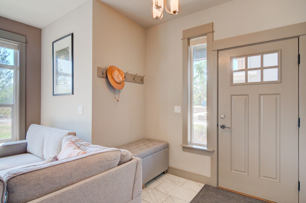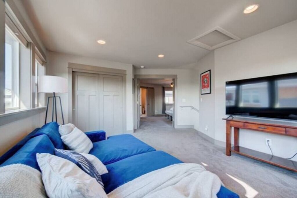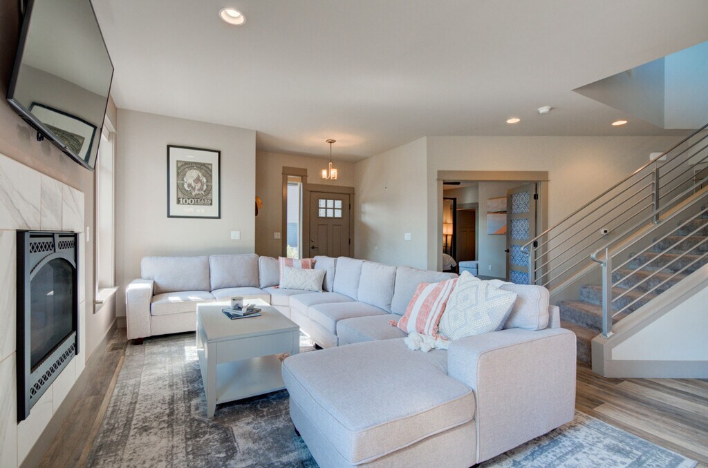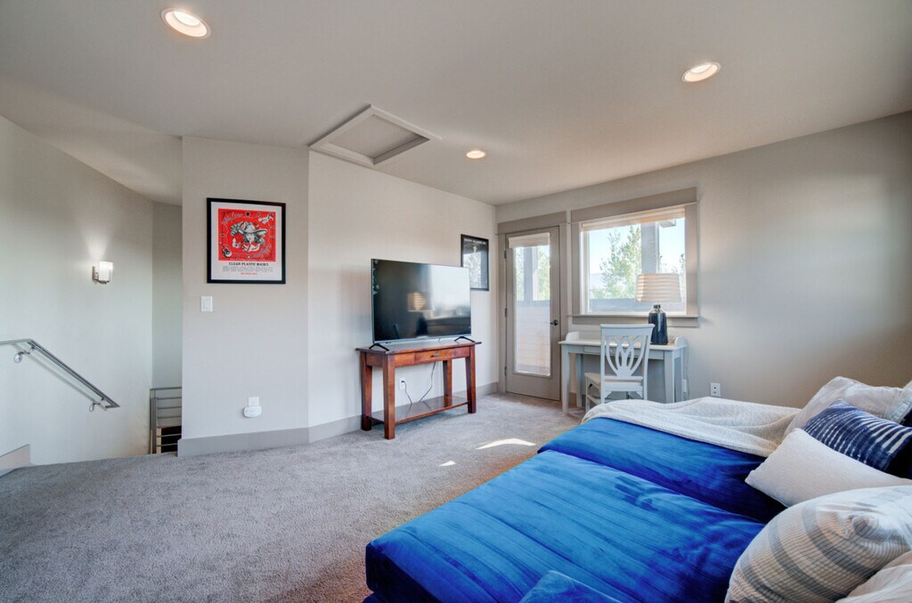 Experience the best of Southwest Montana with this stunning condo, thoughtfully designed for ultimate comfort, convenience, and entertainment. Located on a trail system, this condo offers high-end finishes, ample space, and stylish furnishings, making it the perfect home base for your adventures. Enjoy fantastic views and easy access to various parks and playgrounds. This condo features three bedrooms and two bathrooms, accommodating up to eight people. The primary bedroom, located on the upper level, includes a new king-size mattress, a walk-in closet, and a private en-suite. The second bedroom has a new queen mattress with shared access to a Jack and Jill bathroom, while the third bedroom features a new king-size mattress and a private, accessible entrance. The living space offers a large flat-screen TV, a giant comfy sectional, and a gas fireplace. The fully equipped kitchen boasts modern stainless steel appliances, a gas range, a drip coffee maker with filters, a French press, and a kettle. Bar seating and a dining table are also available. Additional amenities include a bonus room with a large Smart TV, a dedicated workspace, a comfy sofa that can be used as a bed, and balcony access. A full-size washer and dryer, along with a utility sink, are provided in the laundry room. Enjoy free parking onsite and on the street, with garage parking available for two vehicles. A Pack n Play is included for your stay. Situated in a residential neighborhood in Northwest Bozeman, this condo offers a serene retreat while being conveniently close to shopping areas. Downtown Bozeman and Montana State University are just an 11-minute drive away, Bridger Bowl is approximately 28 minutes away, and Big Sky Resort is an hour's drive from the condo. Bozeman is renowned for its world-class fly fishing, stunning mountains for hiking, mountain biking, rock climbing, skiing, hunting, and backcountry exploring. Yellowstone National Park and abundant wildlife are also nearby. Explore Bozeman’s vibrant arts and culture scene with main street festivals, farmers markets, cultural centers, museums, symphonies, theaters, and art galleries. Easily check-in via the keypad. The entire condo is for guests to use, except for two locked closets. Important house rules include no smoking, no pets, and no parties. Please wash your dishes and start a load of towels on your way out. Includes Wi-Fi, a dedicated workspace, and a comfy sofa that can be used as a bed. A laptop computer is not included. Registration Number: STR23-00063 [SI]