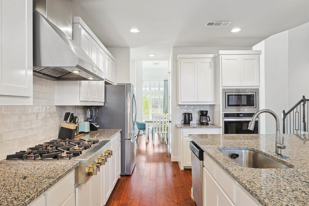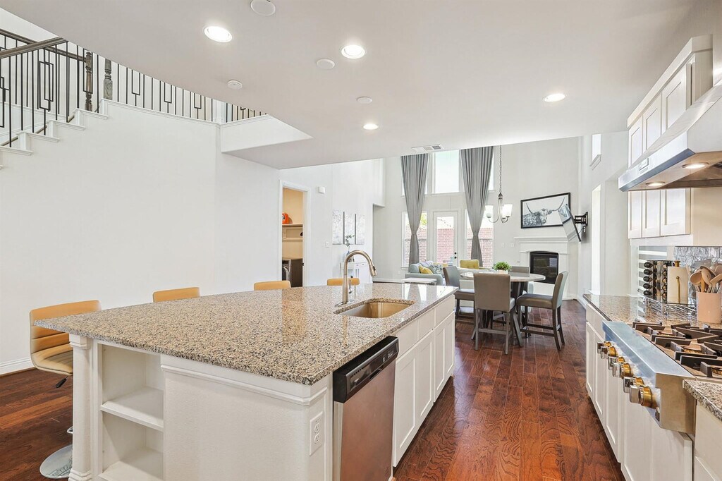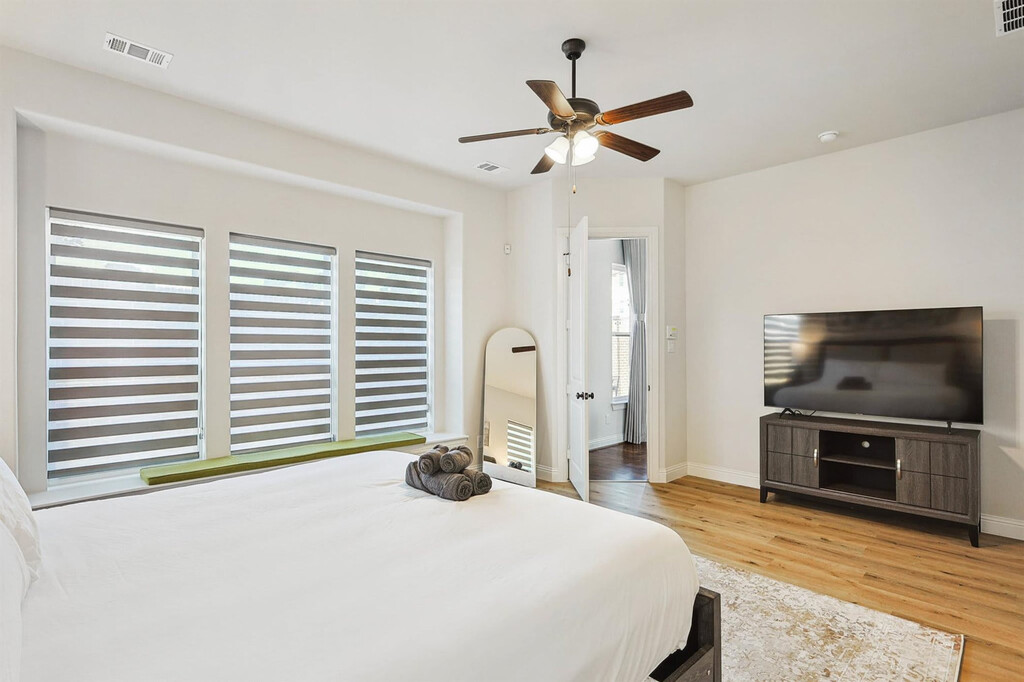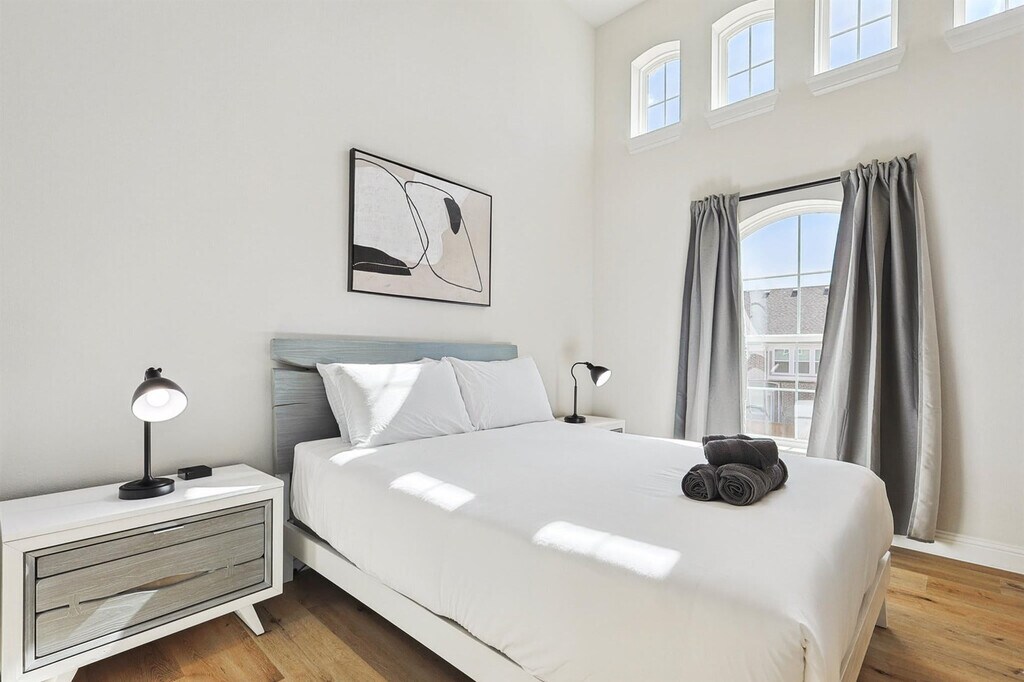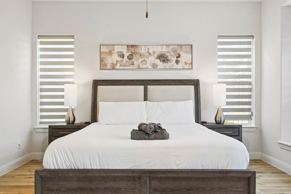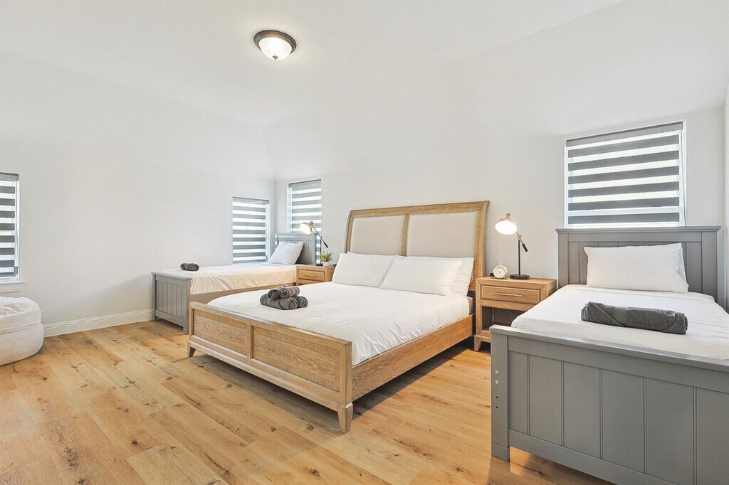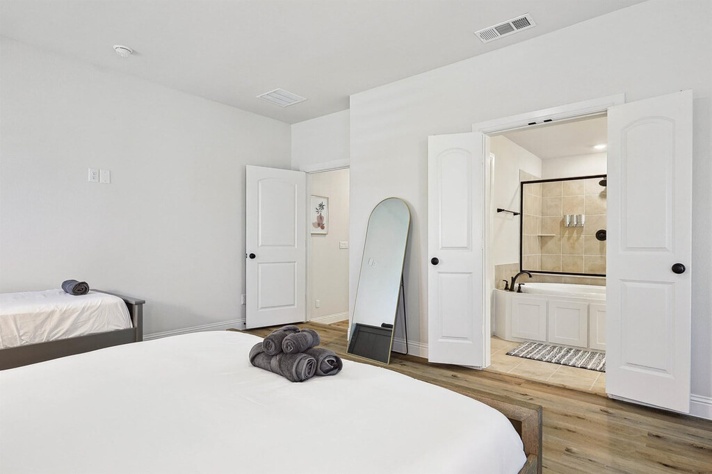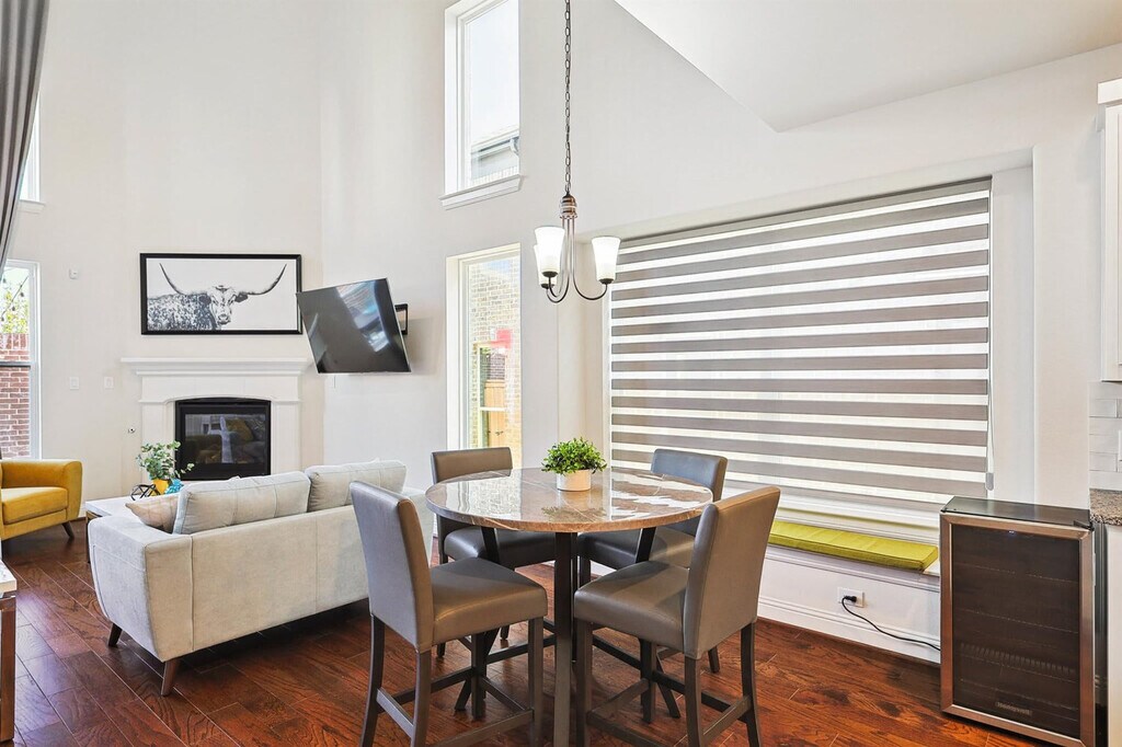 Wow! That’s what you’ll say when you step into this luxurious, brand-new vacation home! With grand features such as floor-to-ceiling windows, high ceilings in the living room, and an open-concept chef’s kitchen, you’re sure to have a delightful time during your stay here. Featuring 6 bedrooms and 5 bathrooms, there’s plenty of space to accommodate groups of up to 13. Located in the brand-new community of Braniff Park, this impressive vacation home is sure to delight from the moment you step through the front door! Stylishly designed with the best of upscale luxury and warm comforts in mind, you’ll find all the comforts of home here in your home away from home. The fully equipped gourmet kitchen, complete with stainless steel appliances, an open concept layout, and an island with seating, is sure to inspire your culinary genius. The dedicated dining area, with a warm and inviting atmosphere, offers plenty of space for everyone to enjoy a delicious meal and lively conversation. The living room, with vaulted high ceilings, comfortable couches, a flat-screen TV, and a fireplace, provides a cozy environment to relax and unwind. The primary bedroom features a king-sized bed and ensuite bathroom, while the additional bedrooms offer a mix of king, queen, bunk, and twin beds, comfortably sleeping up to 13 guests. The 5 bathrooms are equipped with essential toiletries and sparkling clean bathtubs for those who enjoy relaxing bubble baths. Free parking is available to all guests in the garage and on the driveway. We welcome house-trained pets with a non-refundable pet fee of $150 per pet with a maximum of 2 pets per stay. An additional nightly rate of $29 is applied for each guest beyond the first six. The laundry room is fully equipped with a washer and dryer for your convenience. Conveniently nestled between Dallas and Fort Worth and adjacent to the DFW International Airport, Irving is a keystone city in the Dallas/Fort Worth Metroplex! Home to the Mandalay Canals, Toyota Music Factory, and Las Colinas, Irving has a unique vibe with entertainment, fine dining, music galore, and a history all its own. Nearby attractions include the Toyota Music Factory, Jaycee Park Center for the Arts, and Irving Mall. For those interested in exploring Dallas, noteworthy attractions include the Perot Museum of Nature and Science, Dallas Arboretum Botanical Gardens, and Reunion Tower. Smoking of any type is not allowed and violations are subject to a $450 fine plus the cost to clean, deodorize, and repair damages. Check-in is at 4pm and checkout is at 10am. No parties or events are allowed. A noise alert device is installed to monitor decibel levels and ensure compliance with local noise ordinances. The fireplace is gas operated and should not be left unattended. A laptop computer is not included. Pet cleaning fees may be applied and pets should be kept off beds and furniture. Full disclosure of the number of people on the property is required at all times with security camera verification to comply with local laws and booking platform policies. Small low-key gatherings are allowed only upon request and approval in advance. Registration Number: 103588 [SI]