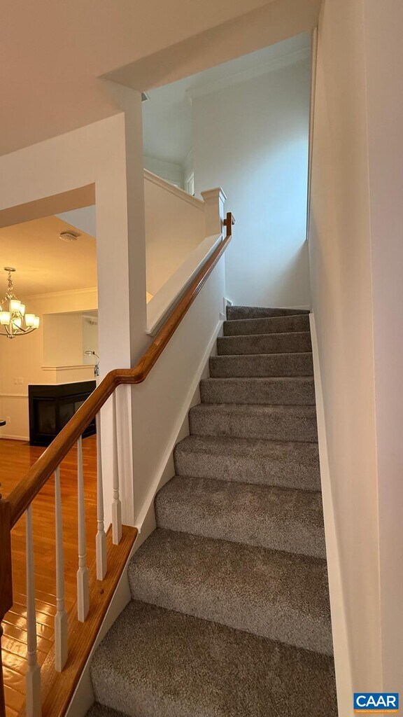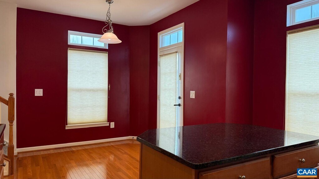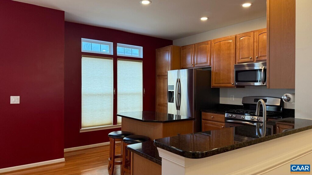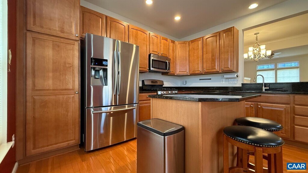 Natural light fills this end-unit townhouse in a quiet neighborhood within walking distance to Hollymead Town Center! An open layout on the main level includes hardwood floors throughout the cozy living room with three-sided gas fireplace, dining room, and large sunny kitchen. Kitchen features a large center island, sitting area, and stainless steel appliances. Brand new carpet in bedroom level. BOSE surround speakers, smart smoke/CO detectors & motion sensor lights. Rear porch off the kitchen overlooks a park-like area, making it a great space to live. Neighborhood features green space, walking paths, picnic tables. Close to parks, wineries, airport & NGIC.