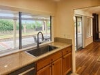 Welcome to this beautifully updated 1,546 square foot single-story home located in a desirable Mission Viejo neighborhood. Offering a bright, open layout and exceptional indoor-outdoor living, this 3-bedroom, 2-bath residence blends comfort, functionality, and inviting outdoor space. Wood-look tile flooring flows throughout the main living areas, complemented by recessed lighting, ceiling fans, and neutral paint tones that create a clean, modern feel. The spacious living room is anchored by a charming brick fireplace and large windows that fill the space with natural light. Sliding glass doors provide seamless access to the expansive covered patio, perfect for entertaining or relaxing year-round. The kitchen features classic wood cabinetry, granite countertops, and stainless steel appliances, including a gas range and built-in microwave. A large sink positioned beneath an oversized window overlooks the backyard, while ample counter space and storage make the kitchen both functional and inviting. A separate dining area also opens to the patio, enhancing the home’s effortless flow. All three bedrooms are generously sized and feature ceiling fans and ample closet space, including mirrored wardrobe doors. Bathrooms have been tastefully updated with modern vanities, quartz-style countertops, contemporary fixtures, and clean tile finishes. Outside, enjoy a large private backyard with an expansive covered patio, concrete entertaining areas, raised planters, mature landscaping, and block wall fencing. The front yard offers excellent curb appeal with manicured landscaping, a gated entry, and an attached two-car garage. This Mission Viejo home offers comfortable single-level living with inviting spaces both inside and out.