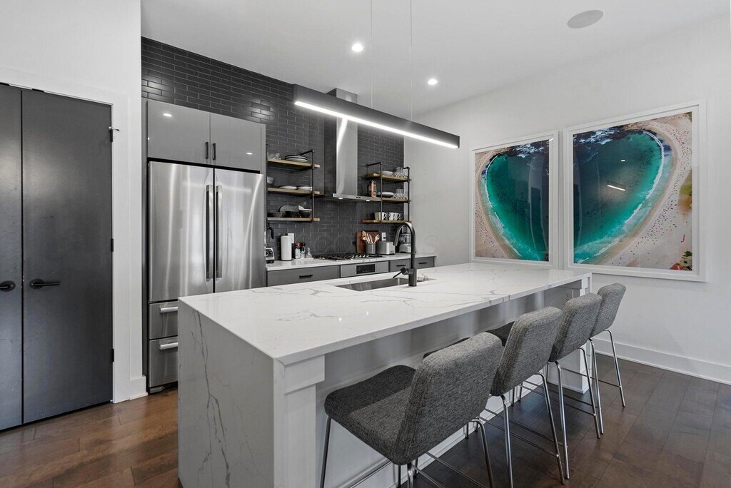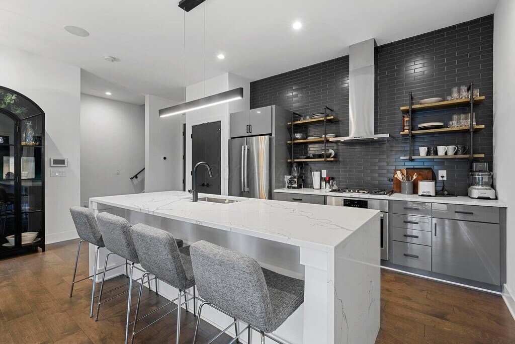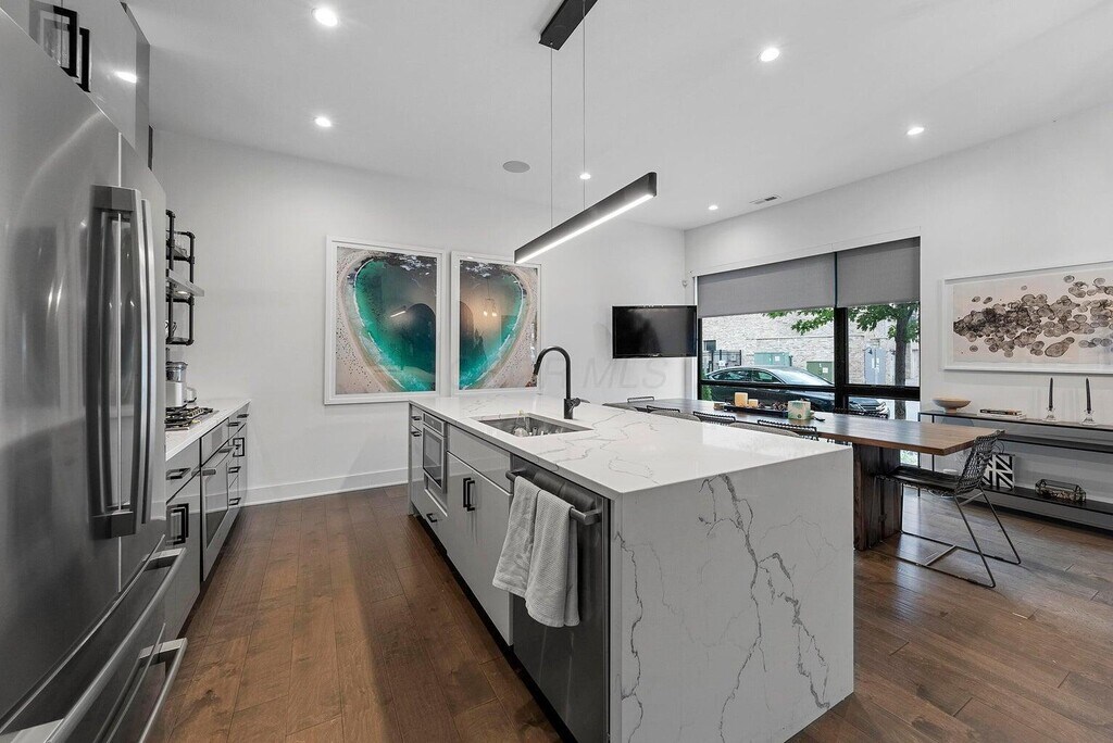 Incredible Modern 25 Jeffrey Park unit! The only unit in the community w/ this exact layout. Interior Elevator,Nana Walls opening to 1 of 2 large rooftop terraces w/ amazing outdoor living! Entry level has Family Room open to Kitchen w/ quartz countertops,flat panel cabinets,large waterfall Island,backsplash,SS Bosch appliance package including dishwasher drawers,gas cooktop & hood. Huge Owners suite w/ massive windows,Oversize walk-in closet & Lux bath w/ double vanity,large shower w/ seat & soaking tub. 3rd floors has Great room w/ 3rd bedroom/office/den & Full bath. Built-in wet bar w/ wine refrigerator & dishwasher. 2nd floor laundry,2-Car attached garage with frosted glass garage door. Walkable to Italian Village / Short North Shops,Restaurants,Parks & Downtown.