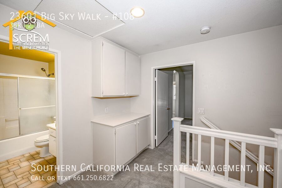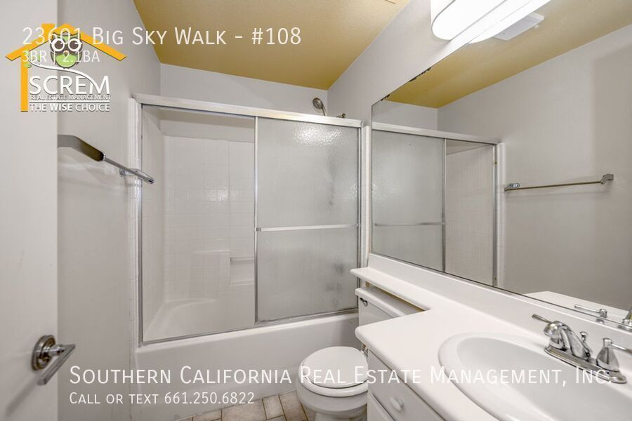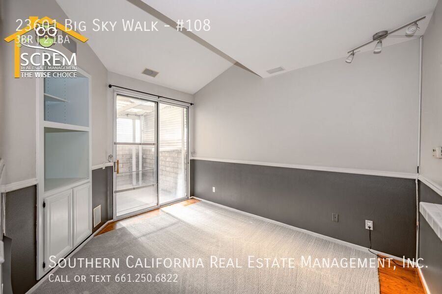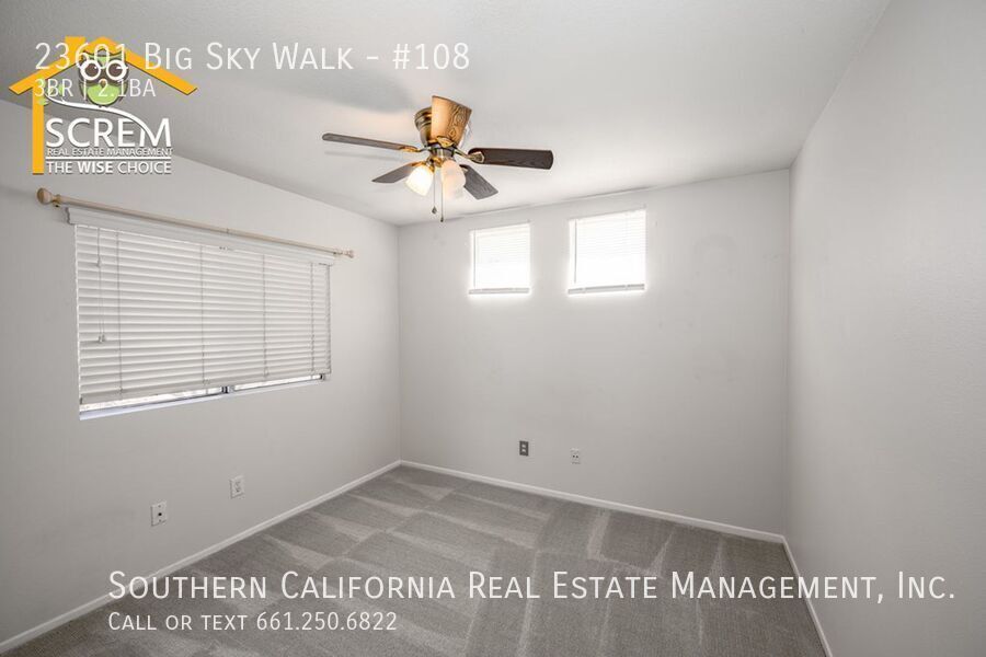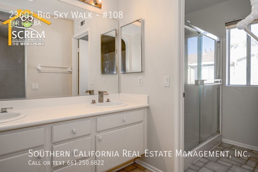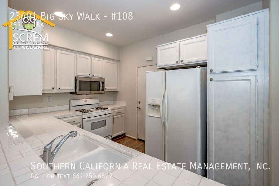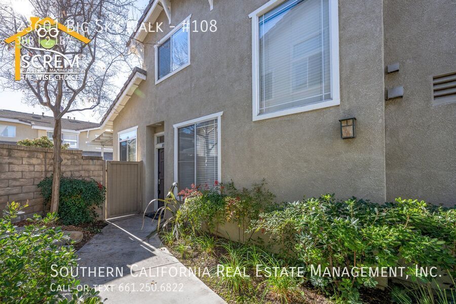 This beautiful three-bedroom townhouse is situated in the desirable Montana community in Valencia. Upon entering, you'll be greeted by an open floor plan. The living room boasts vaulted ceilings, carpet flooring, and a double-sided fireplace. Adjacent to the living room is the dining area, which includes a ceiling fan and leads into the kitchen. The kitchen is equipped with tile countertops, recessed lighting, a gas stove, a single oven, a microwave, a dishwasher, and a refrigerator. Next to the kitchen is the family room, which features a built-in entertainment niche, fireplace, carpet flooring, and a sliding glass door that opens to the private covered patio. The patio has a ceiling fan and a utility sink, perfect for outdoor gatherings. Additionally, there is a half bathroom located downstairs for guests. The spacious primary bedroom includes a vaulted ceiling, a ceiling fan, carpet flooring, a walk-in closet, and an attached bathroom with dual sinks and a walk-in shower. The two guest bedrooms also have ceiling fans, mirrored closet doors, and carpet flooring. The property features a full guest bathroom and an attached two-car garage that includes a full-size washer and dryer. Residents can enjoy the HOA amenities including a pool and spa. *The owner may consider a small pet. For inquiries about this property, please email . To schedule a viewing appointment, visit
