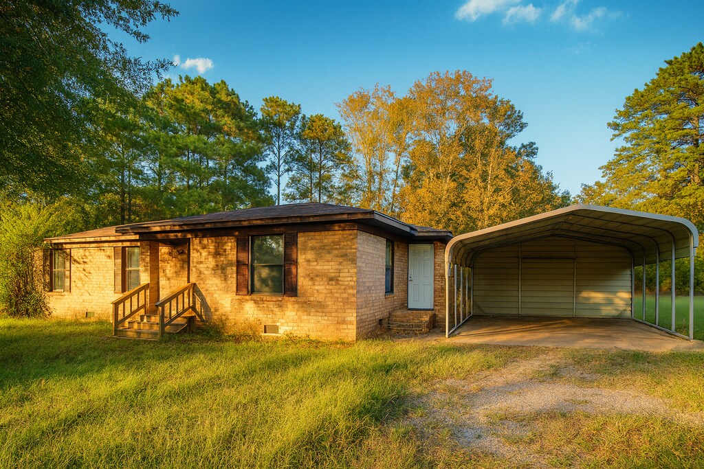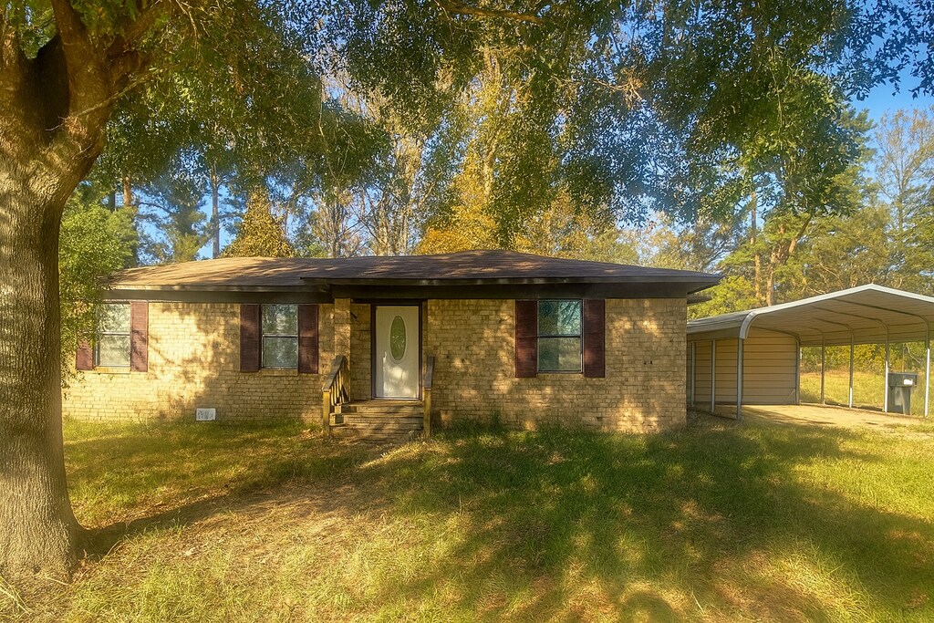 Enjoy quiet country living on almost 3 acres in this 3-bedroom, 2-bath brick home set back from the road for added privacy. This 1,274 sq ft home features an open floor plan, tile flooring throughout, and a spacious kitchen with plenty of cabinets, counter space, a dishwasher, and an electric stove. The living area is bright and roomy, and all bedrooms offer great closet space. The primary bath includes a soaking tub and tiled shower surround. Laundry room and two-car carport included. Clean, move-in ready, and easy to maintain—come enjoy peaceful country living.