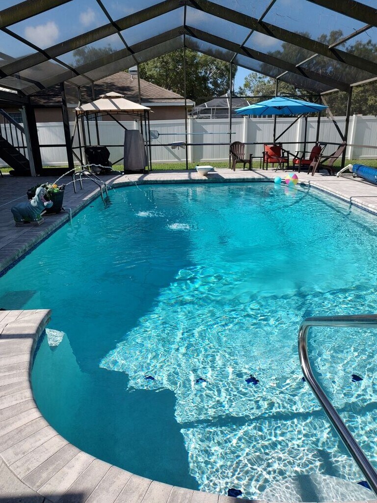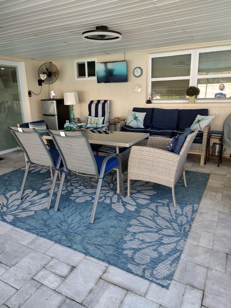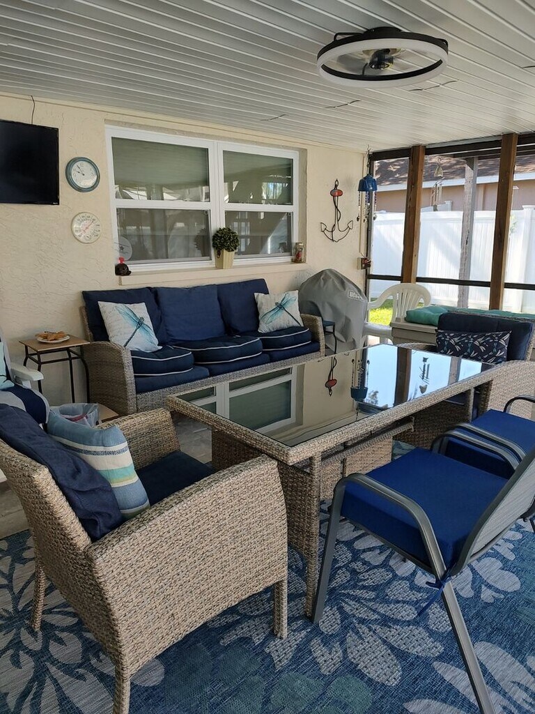 Seasonal rental. Adorable fully furnished pool home. Two bedrooms, two full baths, single car garage. Additional FL room with day bed & trundle, climate controlled with TV and other extras. Features include no carpet, enclosed large 10' deep saltwater pool w/diving board surrounded by new pavers, and rooftop deck (max. capacity 4). Large updated kitchen with plenty of seating and cooking extras. Living room has wall mount fireplace. There is an additional furnished screen room by the pool. Private fenced back yard. This home has so many extra touches to make your stay "kick off your shoes" comfortable. Monthly rent includes pool care, lawn care, pest control, trash removal, water, electric (capped @ $225.00), basic cable & Roku for streaming, and sprinkler system. A little bit of paradise. Pet considered based on approval. Available November 1, 2025 through April 30, 2026.