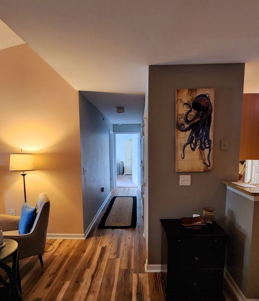 Step out onto your deck located in front of a 16-acre spring fed lake with views from every window. This 2 bed/2 bath, 2nd floor condo in a gated community is a beautiful way to enjoy the peace and quiet of Amelia Lakes. The 1176 square foot condo has a kitchen, living room, dining, laundry room and an ensuite primary with a walk-in closet. The guest suite has a bath right across the hall, and also has 2 walk-in closets in the room. Every room in the condo has been freshly painted, see the before and after pictures above. Included with the condo are the available amenities of a gated community, the pool, exercise room, and car wash. All of this in a beautiful landscaped wooded setting. The building has just been freshly painted outside, and the inside has also been painted. This unit has all new windows, water is included and it comes with a washer dryer, refrigerator, HVAC. This unit is being leased for $1,950 per month. For showings and information call or .