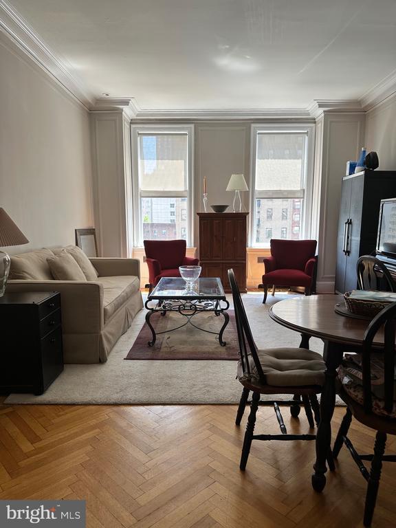 Sun-soaked one bedroom, one bathroom home at The Barclay featuring high ceilings, beautiful crown and baseboard moldings and recessed lighting throughout. The well-equipped kitchen has white cabinetry, tile floor, and white appliances. There is a generously sized living/dining room with herringbone hardwood floors. The bedroom has a large wall closet, hardwood floors, a stackable Whirlpool washer and dryer and an ensuite bathroom appointed in marble with a pedestal sink. Residents at The Barclay enjoy a twenty-four hour doorman, fitness center, chauffeur driven Mercedes, on-site management, and individually controlled heating and air conditioning. Stephen Starr’s Barclay Prime steakhouse is located on the building’s ground floor.