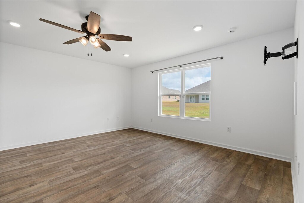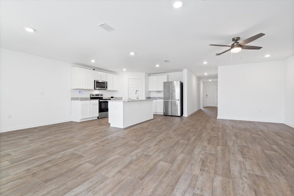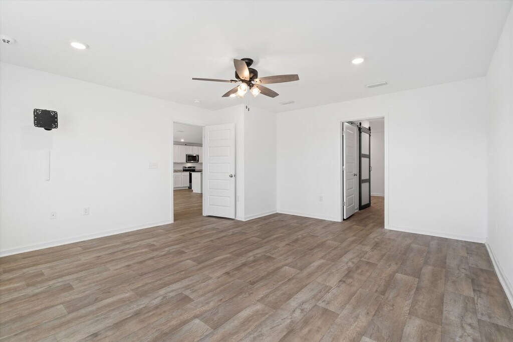 Welcome to 23810 Unbridled Loop, featuring the highly sought-after Ryder Floor Plan on a premium lot in the desirable resort-style community of Jubilee Farms. Built in 2022, this home is filled with abundant natural light and boasts elegant vinyl flooring throughout, recessed lighting, and an upgraded security system. As you enter, you’ll be welcomed by a spacious foyer that leads into an open concept living area and kitchen, complete with sleek white cabinetry, stainless steel appliances, and beautiful granite countertops. The layout includes two bedrooms and a bathroom to the right, with an additional separate bedroom on the left, perfect for a home office or guest suite. At the back, the expansive primary suite offers dual walk-in closets with stylish sliding barn doors, upgraded fixtures, and a striking custom brick accent wall. Enjoy outdoor living on the oversized 9'x22' covered back porch, overlooking serene pond views and lush green space. This exceptional home is a must-see! Call Clint Morgan at to schedule your private showing. Apply at