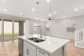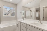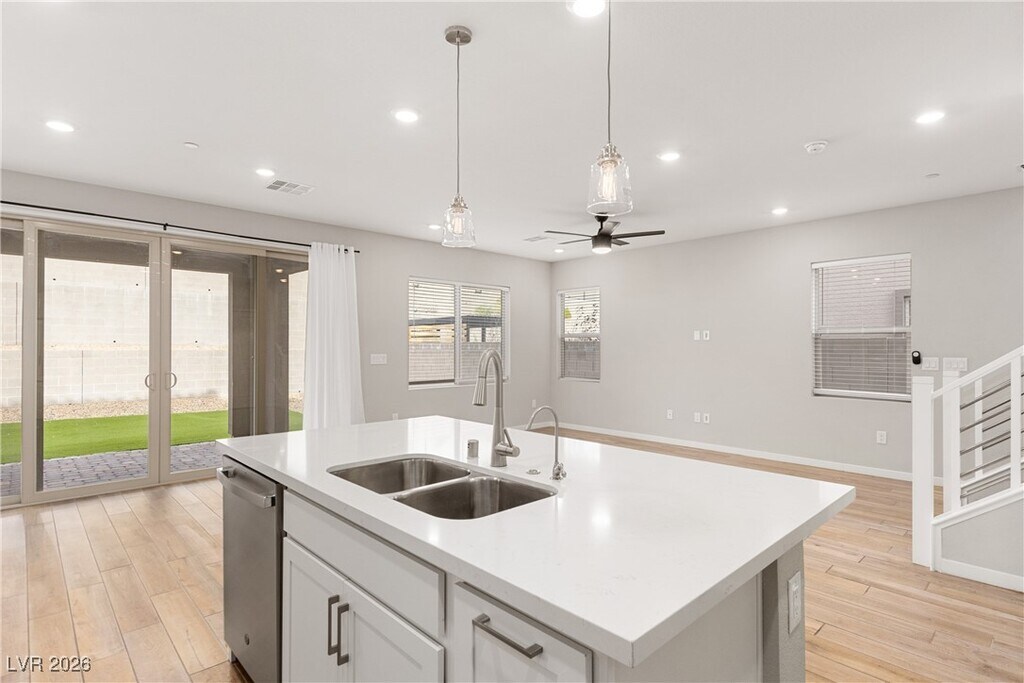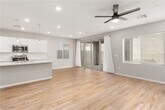 Welcome to this like-new 3-bedroom, 2.5-bath home with a loft located in the heart of Summerlin. Thoughtfully designed and highly upgraded, this residence offers a modern, open layout perfect for everyday living and entertaining. The stunning kitchen is the centerpiece of the home, featuring white cabinetry, quartz countertops, a large island, custom backsplash, pendant lighting, and stainless-steel appliances. Warm wood flooring throughout the main level adds a touch of sophistication, while ceiling fans and window blinds throughout the home provide comfort and style. Upstairs, you’ll find a versatile loft ideal for a home office, media room, or additional living space, along with well-sized bedrooms and bathrooms. Step outside to a covered patio and low-maintenance backyard with artificial turf, perfect for relaxing or hosting guests. This move-in-ready home combines modern finishes, functionality, and an unbeatable Summerlin location close to parks, trails, shopping, and dining.