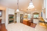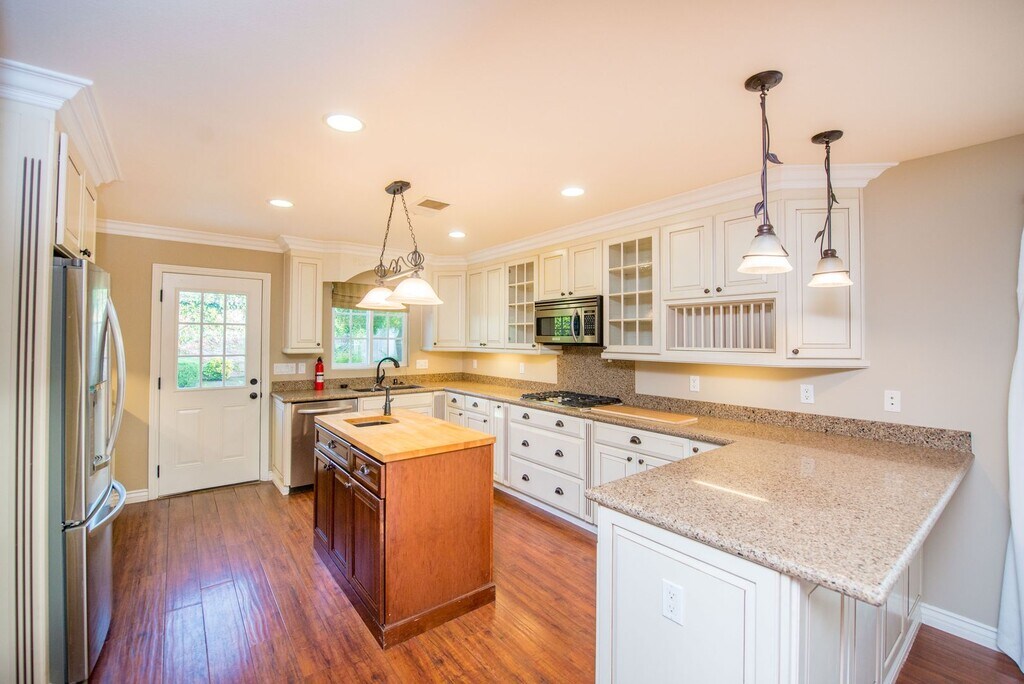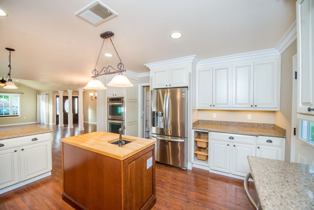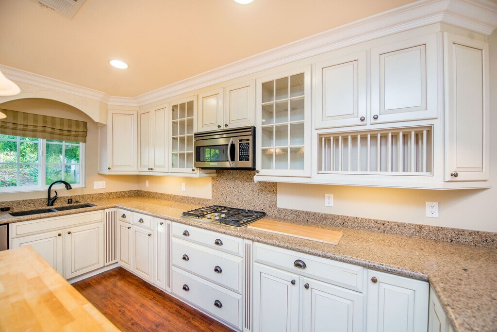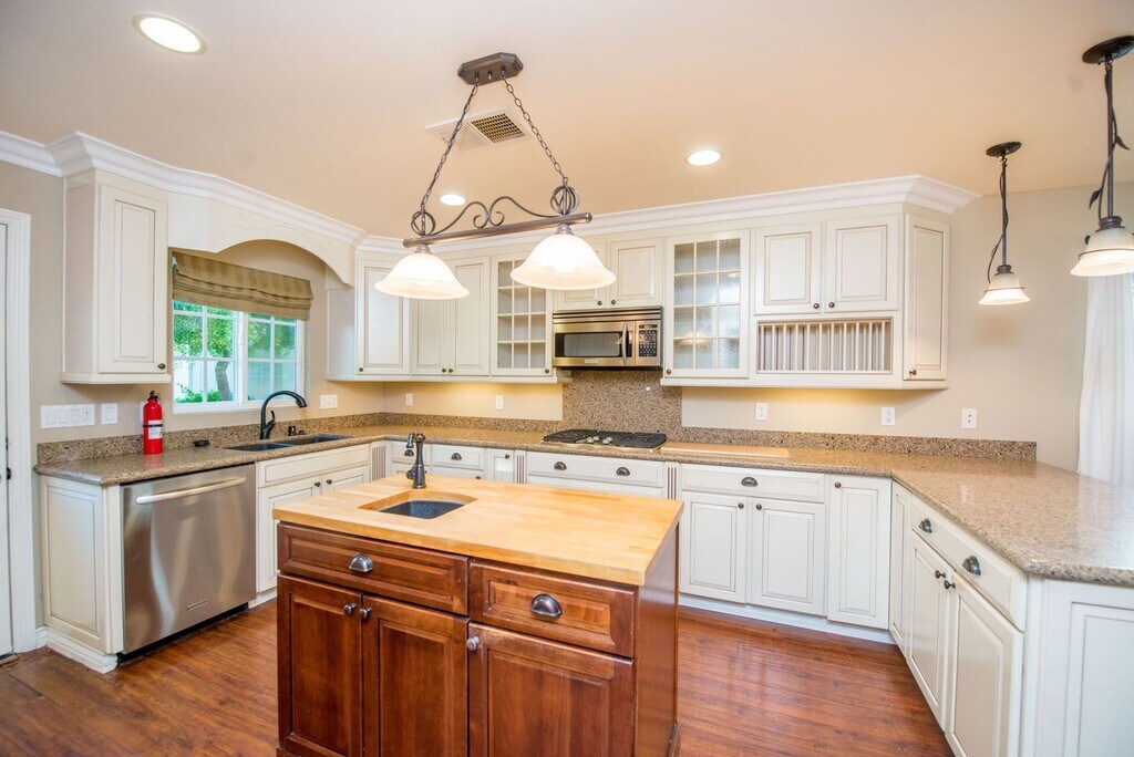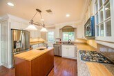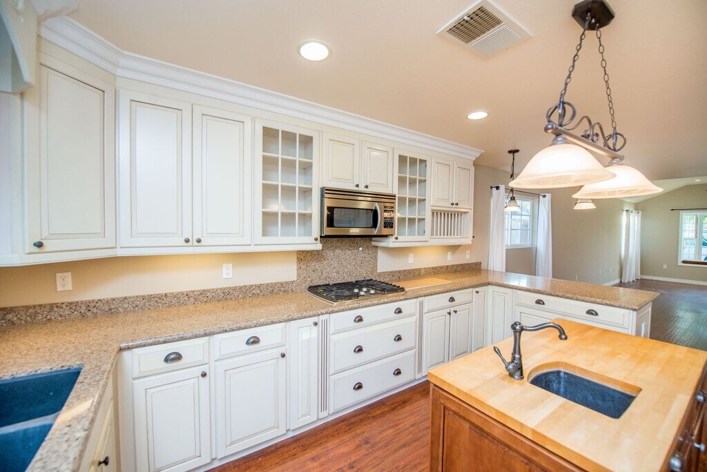 A "Must See" to really appreciate this beautiful home! 2 bedrooms + 1 den 2 1/2 bathrooms Remodeled Kitchen has granite counter tops with a butcher block wet bar Beautiful Cabinets Stainless Steel Appliances including a double oven and gas range Built In Buffet in Dining Area Inside Laundry Room Large Master bedroom with walk in closet En Suite bathroom has double sinks, roman tub, large shower Built in Cabinetry in the dining area Wood flooring Single story 2 car garage New Paint New Carpet in 2 bedrooms Ceiling Fans Air Conditioning
