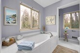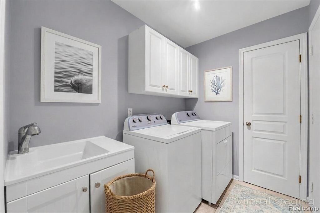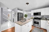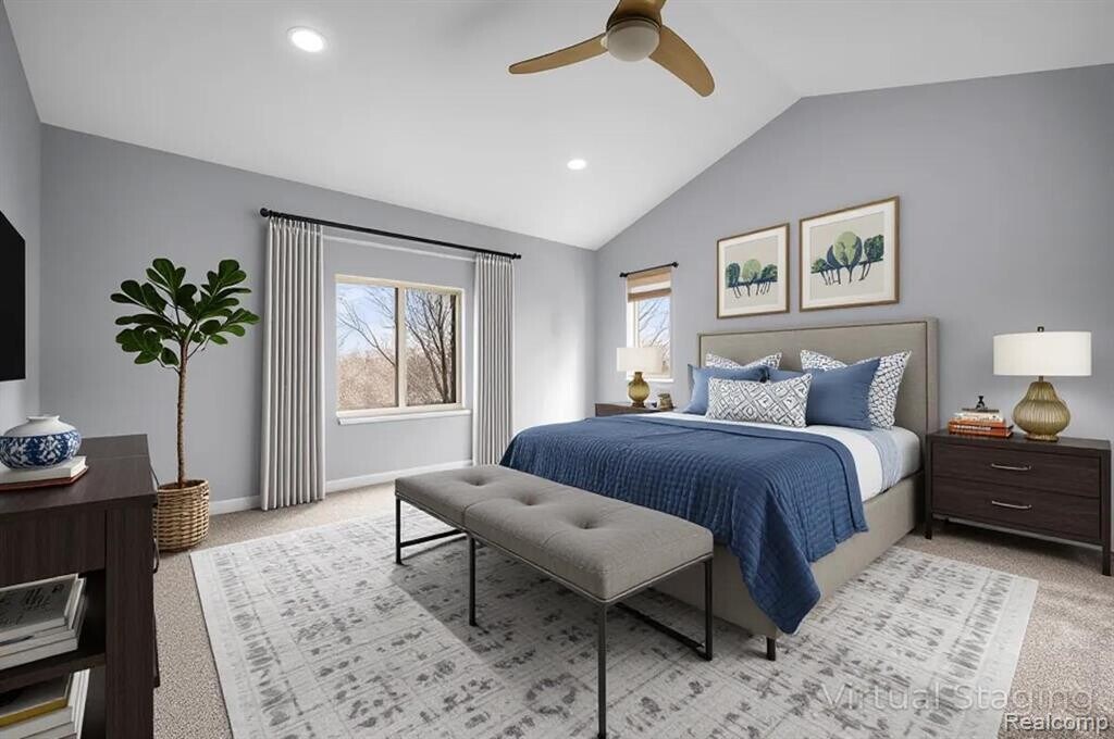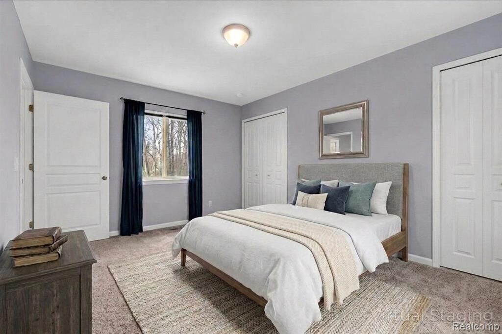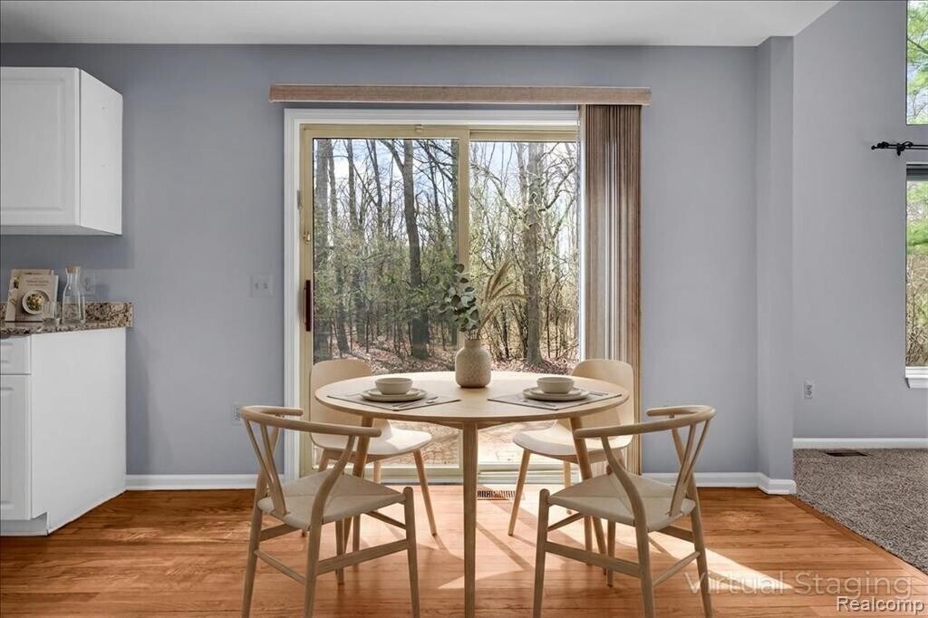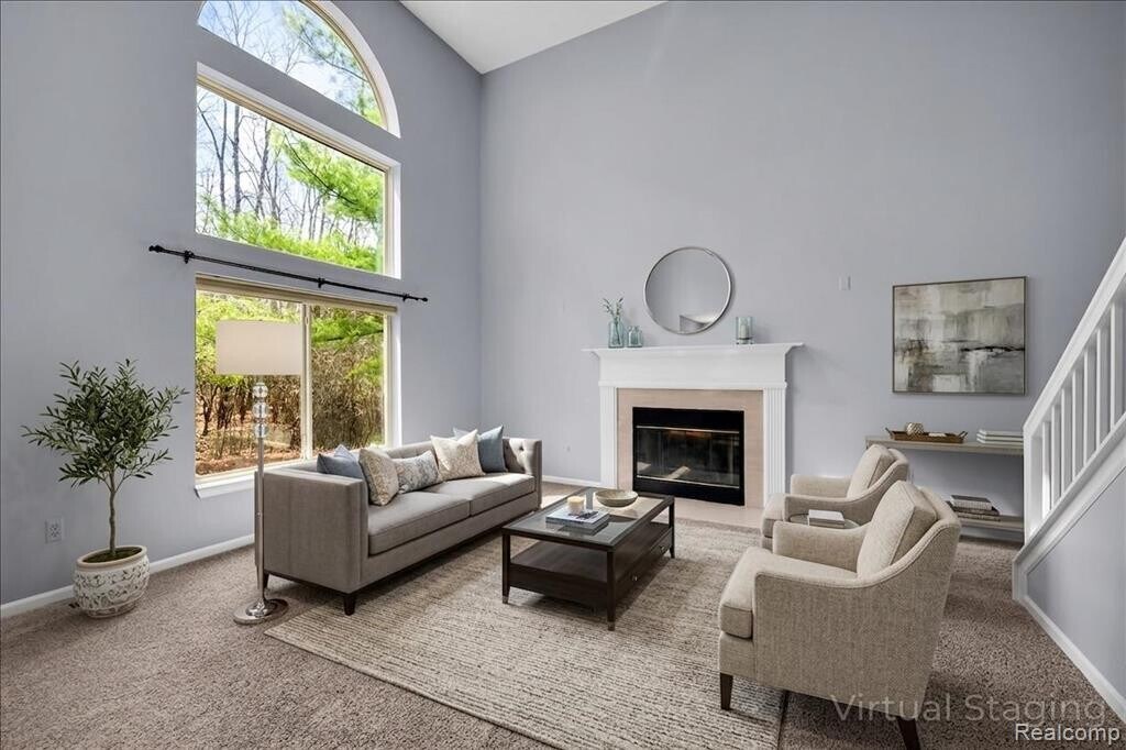 Welcome to this well-appointed 4-bedroom, 2.5-bath home featuring a dramatic two-story foyer with ceramic tile entry. The interior has been freshly painted and new carpet installed throughout the first floor. The open foyer flows seamlessly into a large formal living and dining room, highlighted by expansive windows and serene views of the private wooded backyard. The island kitchen is equipped with granite countertops, new stainless steel refrigerator, dishwasher, and microwave. A convenient built-in desk area and opens to a bright breakfast nook with a doorwall leading to a private paver patio—perfect for relaxing or entertaining. Adjacent to the kitchen is the impressive family room with a soaring two-story ceiling, skylights, and a cozy gas fireplace. First floor laundry and half bath complete the main level. Dual staircases, including one from the foyer and one to the family room, provide easy access to the upper level. Upstairs, the spacious primary suite features a vaulted ceiling with ceiling fan, large walk-in closet, and an ensuite bath with dual vanities, soaking tub, and separate walk-in shower. Three additional generously sized bedrooms and a full bath with dual sinks complete the upper level. The part-finished lower level offers additional living space, ideal for a recreation room, home office, or gym. Additional highlights include hardwood flooring in the kitchen and breakfast area, plush carpeting throughout the main living areas, and abundant natural light throughout the home. Ideally located near freeways, shopping, and dining, this home offers both privacy and convenience in a desirable setting. The home photos are virtually staged. Some cabinet doors are being replaced and will be installed in the next couple of weeks. RentSpree application $39 application fee, ask your realtor for the link to application.