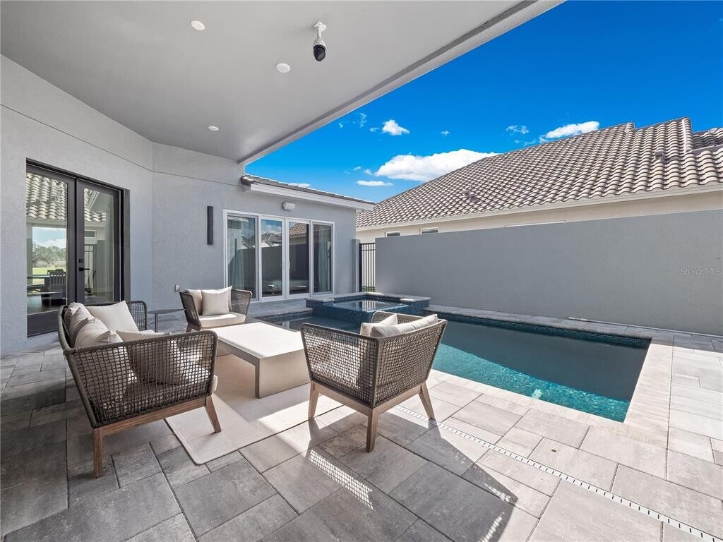 Located in the gated golf community of Providence,this stunning semi-custom 4-bedroom,3 full bathroom,and 2 half bathroom home is truly a must-see. From the moment you arrive,you'll notice the upgraded landscaping and beautiful water feature,creating a welcoming first impression. As you open the front doors,you're greeted by a private courtyard with a heated pool and built-in spa,offering a peaceful and secluded outdoor living space. To the left of the courtyard is a private office with a half bath,sliding patio doors,and direct access to the garage. This thoughtfully designed home also features a separate in-law suite with its own full bathroom,large vanity,and walk-in shower with glass doors,along with sliding doors overlooking the pool area. Double doors connect the suite to the main home,providing both privacy and convenience. Inside the main living space,the home showcases an ultra-modern design with high ceilings,upgraded baseboards,wood-look tile flooring throughout,and no carpet anywhere in the home. The open floor plan includes a stylish living area with a built-in fireplace and fantastic golf course views. The upgraded kitchen features sleek black cabinetry,white quartz countertops,a Samsung cooker hood,flat-top stove,closet pantry,and glass cabinet doors,creating a contemporary and functional cooking space. The spacious primary suite offers sliding glass doors leading to the pool area and a luxurious spa-like bathroom complete with a soaking tub,walk-in shower,dual sinks,and a charming barn-style door. Upstairs in the main home,you'll find two generously sized bedrooms that share a well-appointed bathroom. Residents of Providence enjoy exceptional resort-style amenities,including an 18-hole golf course,lap pool,resort-style pool with waterslide,fitness center,restaurant and bar,tennis and pickleball courts,and two dog parks. Conveniently located near ChampionsGate,I-4,Disney,Celebration,and many of Central Florida's top attractions,this home offers the perfect blend of luxury,privacy,and convenience. Schedule your private showing today. MLS# S5145357