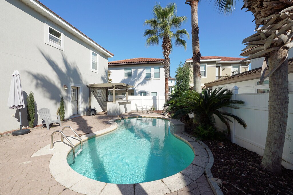 This distinctive property offers three bedrooms and two and a half baths in the main home, plus a separate guest suite situated above the one-car garage--perfect for visitors or a private office space.Enjoy outdoor living at its finest with a sparkling in-ground pool, brick-paved courtyard, covered pergola, and outdoor kitchen--ideal for both relaxing and entertaining.Inside, the kitchen features stainless steel appliances, granite countertops, and a central island overlooking a cozy gas fireplace. A charming exposed brick wall adds warmth and character to the space. Gorgeous hardwood floors flow throughout the main living areas and bedrooms, while travertine tile enhances the bathrooms.Located in the gated community of Calusa Bay, just one mile east of Destin Commons....