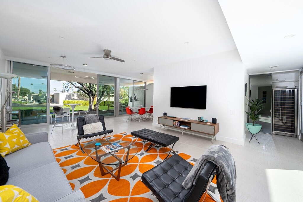 STUNNING VIEWS at the Seven Lakes Golf and Country Club in South Palm Springs await you! This renovated 2 bedroom / 2 bath home features 1,545 sq ft of living space and is positioned along a quiet setting,on the 9th TEE of the Ted Robinson-designed golf course. From the courtyard,favor expansive mountain views from all directions,as well as,the Bob Hope estate. You will also enjoy lakeside and fountain views from the living room. This home has been professionally renovated with ceramic tile flooring throughout. The remodeled kitchen boasts walnut cabinetry,quartz counters,stainless steel appliances. Adjacent to the kitchen,there is a wine cooler for all your entertaining needs. The thoughtfully designed bathrooms are lined with fresh white tile,mosaic accents,along with new cabinetry,sinks and faucets,etc. Newly installed double-panel sliding doors throughout keep the inside temperatures comfortable during summer months. Electric shades and blackout shades in the bedrooms,make it even easier to stay cool in the desert. Known as ''The Gem of the Desert,'' Seven Lakes is a 24/7 guard gated community. Unwind at one of the nearby 15 community pools/spas.