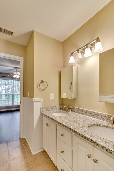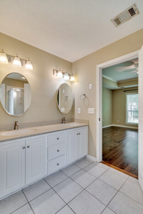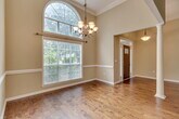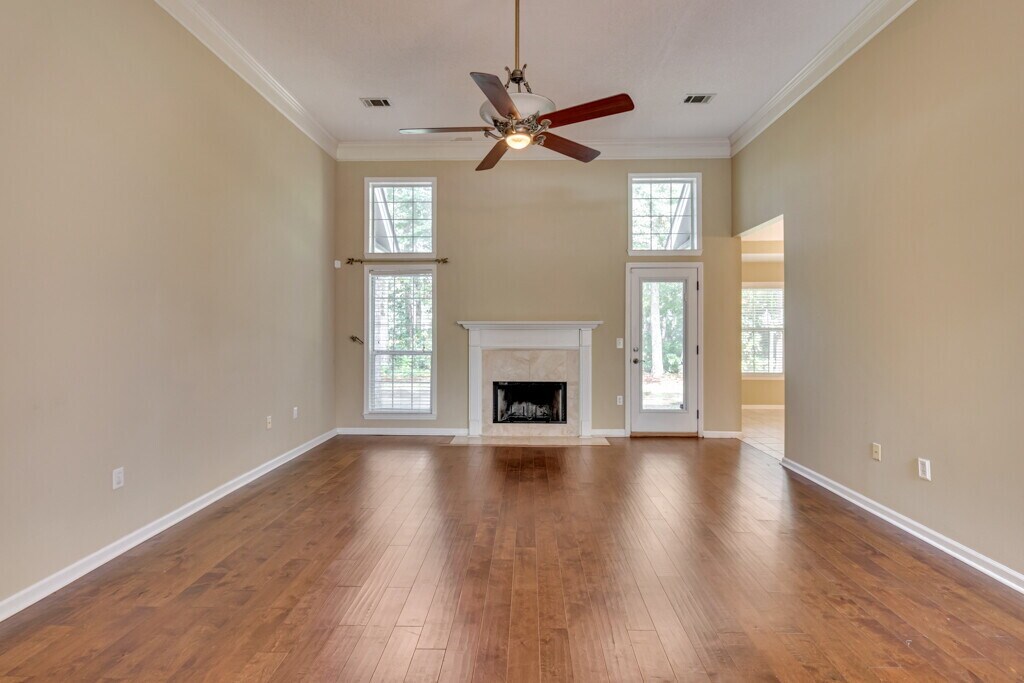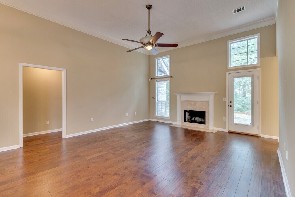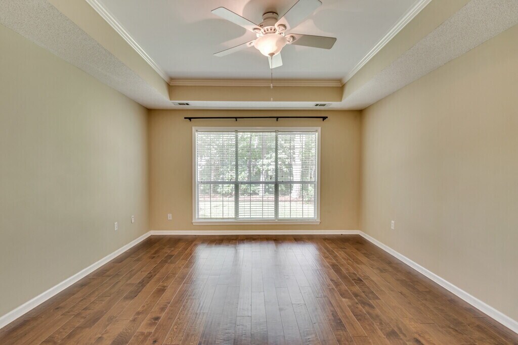 The home features a great open floorplan with high ceilings, elegant columns, upgraded moldings and hardwood floors. The spacious modern kitchen boasts stainless steel appliances and solid surface countertops with an undermount sinks. The large master suite has a tray ceiling, huge walk-in closet, separate garden tub and shower, and duel sinks. Two bedrooms on the opposite end with a Jack-and-Jill bathroom and a great bonus room/fourth bedroom on the second floor Enjoy the serene wooded back yard with extra-large patio. This home is in an amenity packed community that features lagoons, swimming pool, playground, tennis courts and basketball courts.