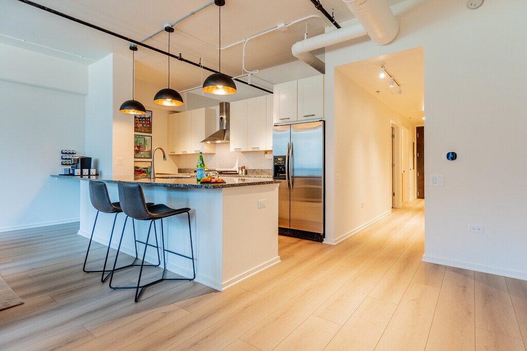 Spacious South-Facing One Bedroom 1.5 bath + Den at The Fairbanks, this beautifully maintained south-facing one bedroom plus den offers over 1,020 square feet of light-filled living space and stunning skyline views. Floor-to-ceiling windows, 9-foot ceilings, and rich hardwood floors create an open and airy feel throughout. The expansive living and dining area is perfect for both relaxing and entertaining, seamlessly flowing into the open kitchen featuring a breakfast bar and ample cabinetry. The generous primary suite boasts a wall of windows, space for a full king-sized bedroom set, and a luxurious stone bath complete with dual vanities, a soaking tub/shower and double closets. The versatile den is ideal for a home office, guest space, or reading nook. A powder room and in-unit washer and dryer add everyday convenience. The Fairbanks is a full-amenity, professionally managed building offering 24-hour door staff, a fitness center with cardio and weight rooms, sauna, outdoor pool with sundeck and grilling stations, and an entertainment room. Unbeatable location with elevator access to Whole Foods, steps to Michigan Avenue, two blocks to the lakefront, and just blocks from Northwestern Medical Campus. Available June 1
