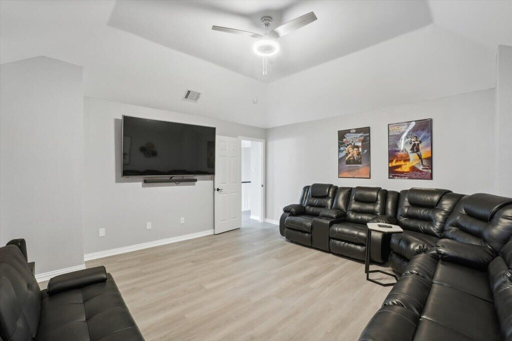 Wow! That’s what you’re going to say when you see this gorgeous 5-bedroom, 3-bathroom vacation home. You’ll have exquisite touches in every corner of this house, from the large open living room with its wall of windows to the dream kitchen and serene backyard including an outdoor swimming pool and patio area. This colonial-style mansion is a dream for anyone looking to experience southern charm at its finest. Featuring 5 beautiful bedrooms and 3 luxury bathrooms, this house easily caters to large groups of up to 12 guests. There are so many bells and whistles here that you’re sure to be impressed. With all the amenities included in this house, this is the experience vacation homes are meant to deliver. Full of upgraded finishes and luxury design elements, you’ll wish you had this kitchen in your house. The fully equipped chef’s kitchen includes stainless steel appliances, cooking essentials, quartz countertops, a center kitchen island, and a breakfast bar. The living room offers comfortable seating, coffee tables, a flat-screen TV, high-speed Wi-Fi, high vaulted ceilings, and a wall of windows for plenty of natural light. The primary bedroom includes an en-suite bathroom, and all rooms feature nightstands, bedside lamps, and pleasing artwork. The bathrooms have an ultra-modern look and feel, with walk-in standing showers, bathtubs, and a spa-inspired en-suite bath with separate double vanities, a large soaking tub, and a sleek glass shower. The serene backyard is perfect for entertaining family and friends, featuring a large side yard with landscaped greenery, a patio set, an outdoor grill, and a fully fenced backyard for privacy. The cinema room brings the theater experience home with a cinema screen, sound system, and theatre-style seating. Free parking is available to guests with plenty of space in the garage and on the driveway. A laundry room with a washer and a dryer is available for your use. Pets are welcome with a non-refundable pet fee of $150 per pet, with a maximum of 2 pets per stay. An additional nightly rate applies for more than 6 guests, with a $29/night fee for each additional guest. Experience the perks of lakeside living in Rowlett. As a suburb of Dallas, this growing upscale community prides itself on cultural charm, distinctive amenities, and lakeside living. While you’re here, check out Lake Ray Hubbard, one of the largest lakes in north Texas, perfect for fishing, skiing, kayaking, and relaxing, just a 12-minute drive away. The Rowlett Wet Zone, a water park offering a playground, slides, swim lessons, and aerobics, is only an 8-minute drive. The Rowlett Community Center, a state-of-the-art multipurpose recreation facility with a fitness room, racquetball courts, gymnasiums, an indoor track, and a game room, is also an 8-minute drive. With over 600 acres of parkland for recreational enjoyment, such as Lakes of Springfield Park, Rowlett Nature Trail, and the Rowlett Community Park, there’s plenty to explore. For those interested in exploring Dallas, Celebration Station, an amusement park with bumper boats, arcade, mini-golf, go-karts, and American eats, is a 19-minute drive. Town East Mall, one of the largest retail destinations in the Dallas-Fort Worth area, is a 16-minute drive, and the Dallas Arboretum Botanical Gardens, a nationally acclaimed 66-acre display garden, is a 23-minute drive. Smoking of any type is not allowed, with violations subject to a $450 fine plus the cost to clean, deodorize, and repair damages. Check-in is at 4pm and checkout is at 10am. No parties or large unauthorized gatherings are allowed. Only registered guests are permitted on the property. The fireplace is gas-operated and should only be used if you are familiar with its operation, and it should not be left unattended. The spa heating element and jets are inoperable. Noise level monitoring is in place to comply with local noise ordinances and prevent unauthorized parties. A pet cleaning fee applies, and pets should be discussed in advance. Full disclosure of the number of people on the property is required at all times with security camera verification to comply with local laws and booking platform policies. Rest assured, there are no cameras in any inside private areas, respecting the privacy of guests. Small low-key gatherings are allowed only upon request and approval in advance. Registration Number: 24-005769 [SI]