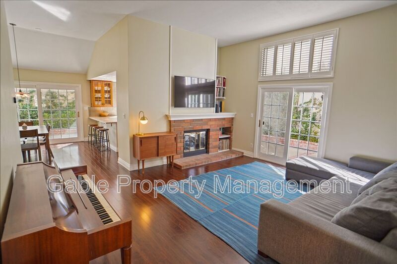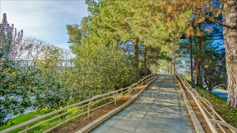 Welcome to this beautifully updated home located in the highly desirable Bungalows of Valencia, tucked away on a quiet cul-de-sac with great curb appeal. This residence offers 2 bedrooms, 3 bathrooms, and a spacious loft with an attached bathroom that could easily be used as a third bedroom. The inviting white wood-and-glass front door opens to a bright interior featuring high ceilings, custom paint, wood flooring throughout, and large windows that fill the home with natural light. The main-level bedroom is conveniently located to the right and includes an attached bathroom with an upgraded vanity and tiled tub/shower. The spacious living room features wood shutters and a brick fireplace with mantel, creating a warm and welcoming atmosphere. The remodeled kitchen boasts custom cabinetry (some with glass doors), upgraded countertops with a breakfast bar, tiled backsplash, recessed lighting, and stainless steel appliances—including a new dishwasher, microwave, oven, and refrigerator. A window overlooks the backyard, and a separate dining area includes an upgraded light fixture. The primary bedroom offers high ceilings, a large closet, and an attached bathroom with an upgraded vanity and tiled tub/shower. Upstairs, you’ll find a generous loft with high ceilings and its own attached bathroom featuring a walk-in shower. Additional highlights include a 2-car attached garage and a private backyard with a covered patio—perfect for relaxing or entertaining—along with a nice side yard. The HOA offers a pool and spa, and the home is conveniently located near parks, award-winning schools, paseos, shopping, restaurants, the mall, and easy freeway access. This home is truly turnkey and a must-see! Included is the gardener, washer, dryer and refrigerator! No Pets!