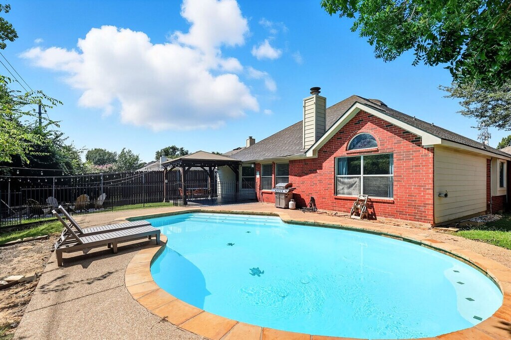 Big and grand with its magnificent brick façade, this vacation home offers a spacious interior filled with natural sunlight, a backyard with a swimming pool reminiscent of a tropical resort, and accommodations for large groups. With four bedrooms and two full bathrooms, this is the perfect holiday escape for you and your companions. Full of southern charm and upgraded features, this vacation home is ideal for a quiet, serene getaway. It includes an outdoor swimming pool and a patio backyard oasis. The fully equipped kitchen, complete with stainless steel appliances, ample counter space, and a kitchen island, invites you to let your inner chef shine. The spacious living area, tastefully furnished with an oversized L-shaped couch, additional chairs, and a flat-screen TV, is designed for creating great memories with family and friends. The stylish dining area, adorned with French-style accents, features a dining table with seating for eight. Free parking is available in the double garage, on neighborhood streets, and on the driveway. A laundry room with a washer and dryer is also available. Pets are welcome with a non-refundable pet fee of $150 per pet, with a maximum of two pets per stay. An additional nightly rate applies for more than six guests, with a $29/night fee for each additional guest. Welcome to Corinth! Located in Denton County north of Lake Lewisville, Corinth is approximately 20 miles north of downtown Dallas and 15 miles southwest of the Dallas/Fort Worth International Airport. With excellent highway access, you can easily make your way into Dallas. Explore local attractions like the Old Alton Bridge, Corinth Community Park, and Lake Lewisville, or venture into Dallas for the ICR Discovery Center, Mandalay Canal Walk, and Six Flags Over Texas. We do not allow parties or large unauthorized gatherings at our property. Only registered guests are permitted. A noise alert device is installed to monitor decibel levels and ensure compliance with local noise ordinances. Smoking is not allowed, with violations subject to a $450 fine plus cleaning costs. Check-in is at 4pm and checkout is at 10am. The fireplace is gas-operated and should not be left unattended. Towels are provided, but guests are welcome to bring their own pool towels. Small low-key gatherings are allowed only upon request and approval in advance.