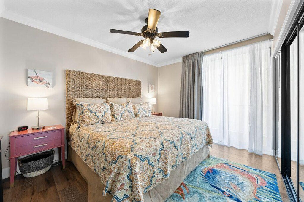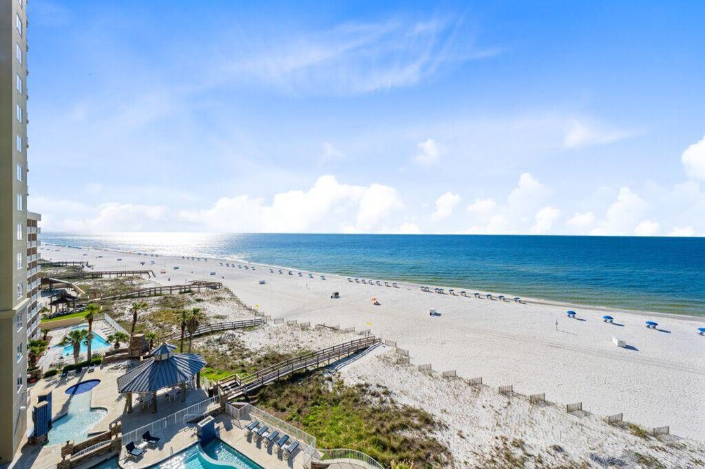 Welcome to your beachfront paradise at Romar Place 801! This spacious condo offers a beautifully furnished living room with comfortable seating and a large flat-screen TV, perfect for unwinding after a day at the beach. The living area seamlessly connects to a private balcony, inviting you to savor the salty breeze and breathtaking views, making you feel at home in your coastal retreat. The modern, fully equipped kitchen is stocked with everything you need to craft delicious meals. Each of the three bedrooms is thoughtfully decorated with comfort and relaxation in mind. The first two bedrooms boast large windows that allow natural light to fill the space, enhancing your beachfront experience. The third bedroom is ideal for families or groups, featuring a twin-over-full bunk bed for a cozy rest. Paid parking is available on-site for $50 each, with a maximum of 2 cars. As a guest in this condo, you'll have access to resort-style amenities, including a sparkling swimming pool, a fitness center, and a relaxing hot tub. A direct boardwalk to the beach grants you easy access to the sandy shores and stunning Gulf of Mexico views. Explore local attractions such as The Wharf, Gulf State Park, Adventure Island, and Orange Beach Waterfront Park, all offering unique experiences and entertainment. Security cameras are installed outside for your safety and protection. The minimum age requirement for check-in is 25 years old from March 1st to May 1st. For same-day late check-ins, host approval is required before booking. No smoking is allowed in the unit or on the balcony, with a $250 fine plus cleaning costs for violations. Quiet hours are from 10 pm to 8 am, with a $200 fine for violators. The condominium association has a strict no-pets policy, except for ADA-compliant service dogs. No parties or events are allowed, with a $500 fine for violations. A state identification card or driver's license copy will be requested upon booking, and the traveler must be at least 22 years of age to make a reservation. [SI]
