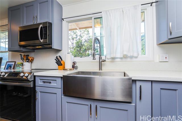 Beautifully renovated single-family home in Palolo Valley. This 2-bedroom, 1-bath home w/846 sf of living area features a fully fenced yard & 2-car carport. Enjoy luxury vinyl plank flooring throughout the home & split air conditioning & ceiling fans in the living room & both bedrooms. The kitchen was renovated & offers newer cabinets, quartz countertops, a deep stainless steel sink, & high-end appliances including a stainless steel French-door refrigerator, built-in microwave, & glass-top stove w/oven. The bathroom was updated w/tile shower surround, glass sliding doors, a new vanity, & new lighting & plumbing fixtures. Full-size side-by-side washer & dryer & stand-alone freezer located in carport. Lease term is twelve months. Tenant is responsible for all utilities except yard service. Owner looking for the unit to be occupied first week of January. Income to qualify is 3 x the monthly rent. Tenant is required to obtain renter's insurance and must provide copy to Landlord prior to occupancy.