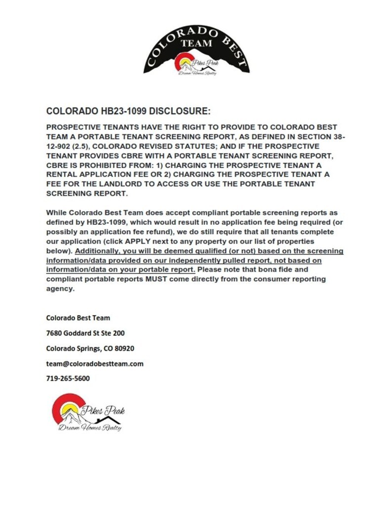 Applicant has the right to provide the property manager or owner with a Portable Tenant Screening Report (PTSR) that is not more than 30 days old, as defined in § 38-12-902(2.5), Colorado Revised Statutes; and 2) if Applicant provides the property manager or owner with a PTSR, the property manager or owner is prohibited from: a) charging Applicant a rental application fee; or b) charging Applicant a fee for the property manager or owner to access or use the PTSR.