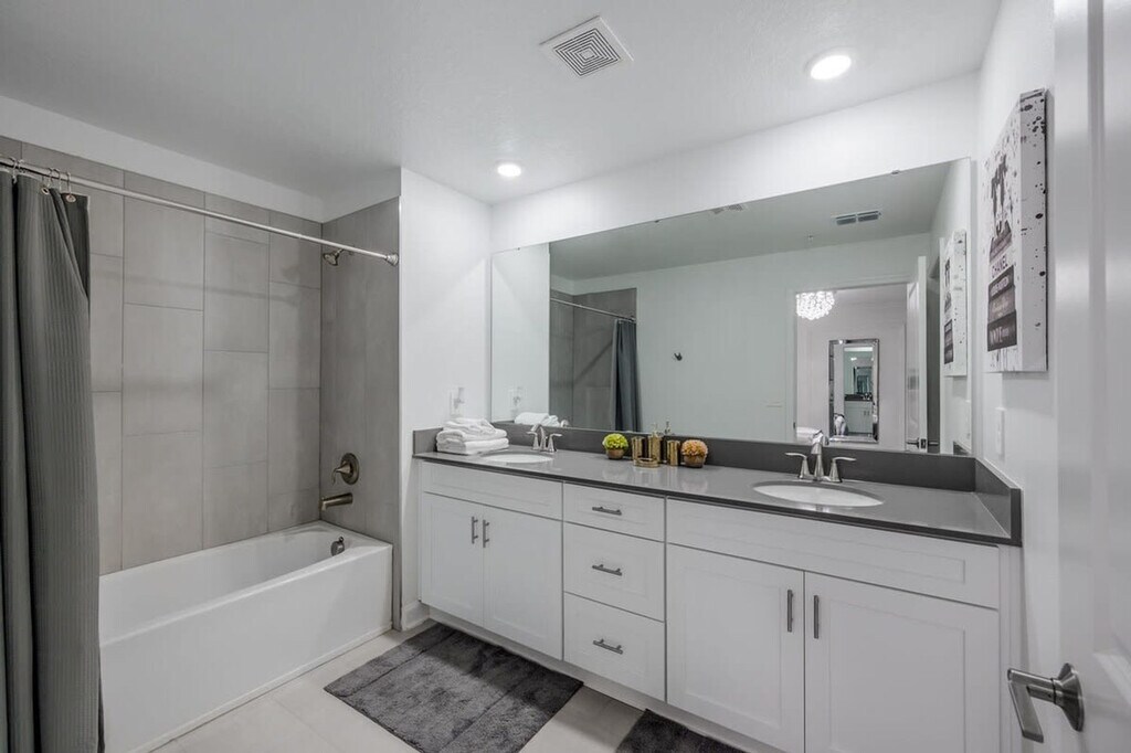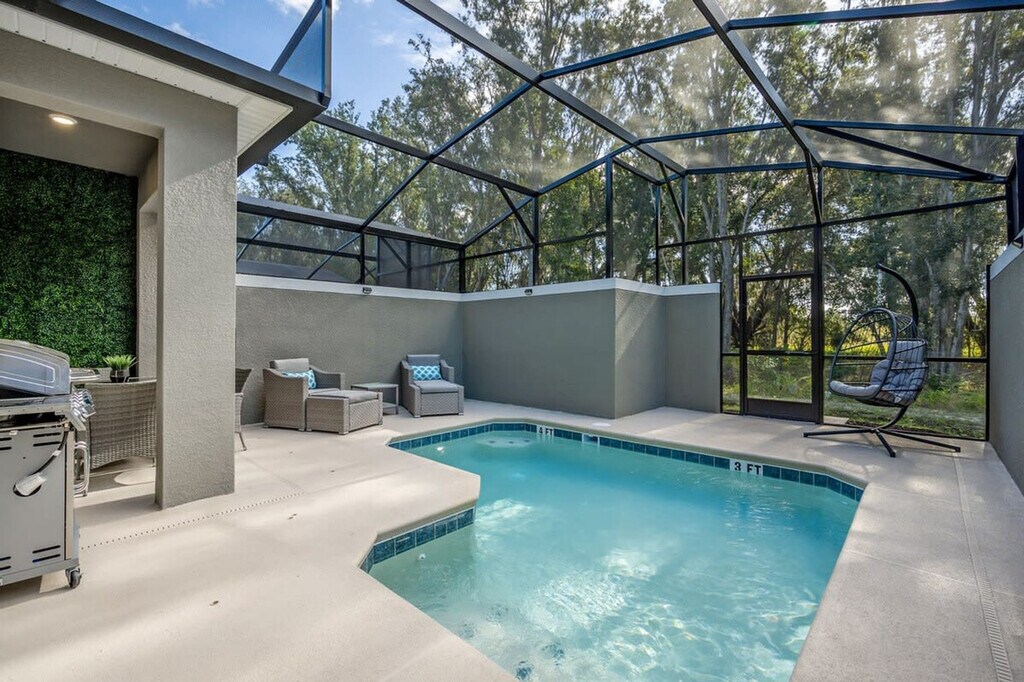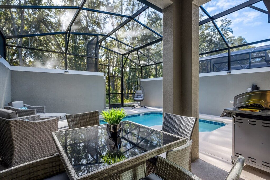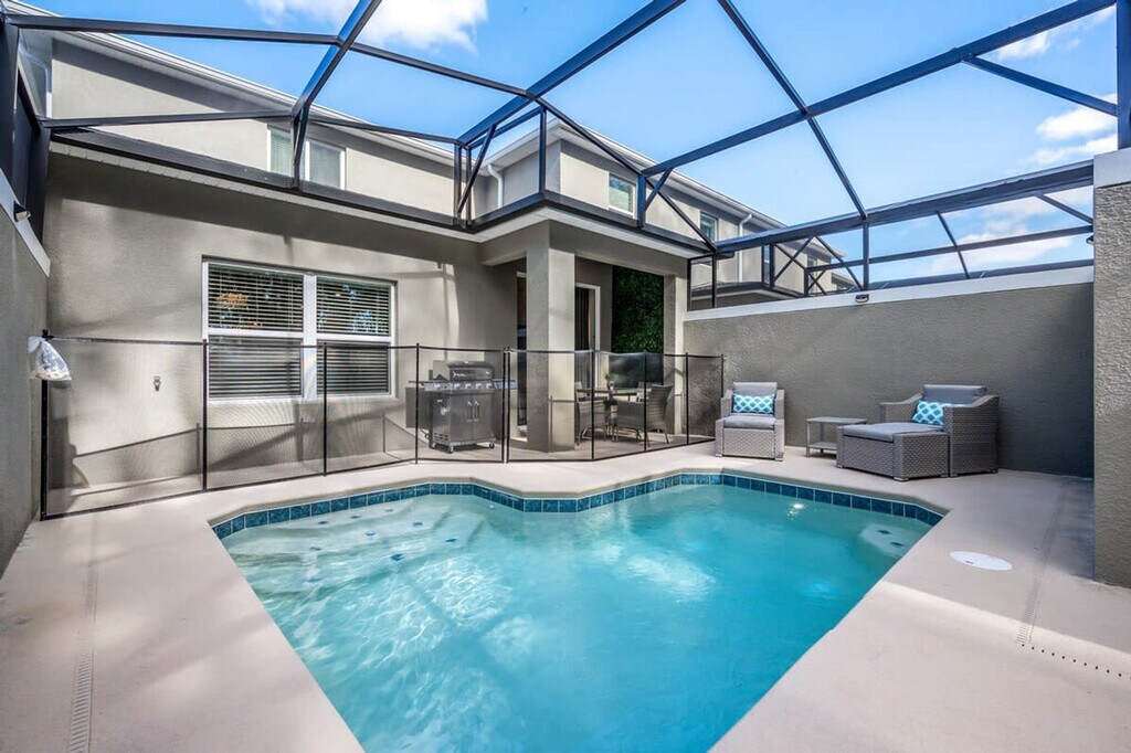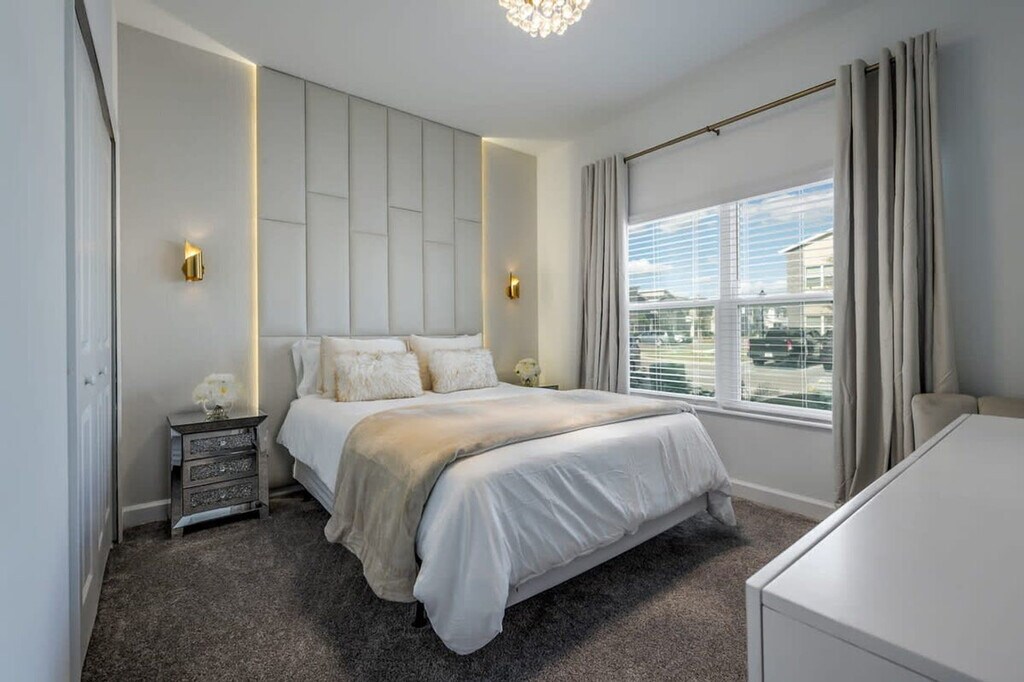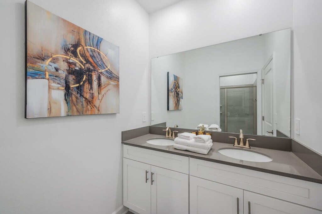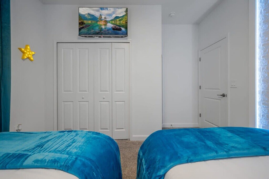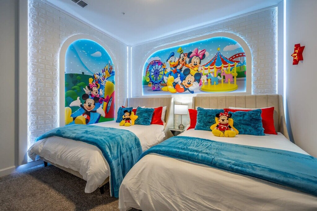 Step into opulence and delight at this exquisite 5-bedroom townhome. Admire the captivating Frozen and Mickey-themed bedrooms and relish boundless happiness at the fantastic private pool area. Whether you plunge into a revitalizing swim or unwind poolside, the experience is unparalleled. Additionally, the Storey Lake resort's clubhouse provides an array of recreational activities, enhancing the enjoyment of your vacation. For extra excitement, venture to the nearby Disney Theme Parks, stores, and restaurants, all within minutes. Indulge in the lap of luxury at this exquisitely adorned villa designed to accommodate up to 12 guests. Upon entry, a spacious living room seamlessly blends with the dining area and fully equipped kitchen, creating an ideal space for entertainment. Every detail has been meticulously prepared to ensure a comfortable stay. The kitchen is equipped with all essential amenities for cooking and dining convenience. Outside, be enchanted by the amazing private heatable pool area. This property features 5 bedrooms across two floors. On the first floor, a charming bedroom with a queen bed and a delightfully fun Mickey-themed bedroom with two double beds share a well-appointed bathroom. Upstairs, luxuriate in two king suites and a beautiful Frozen-themed bedroom featuring two single beds, complete with its private bathroom. In addition to the splendid bedrooms and entertainment spaces, guests can enjoy complimentary amenities such as free Wi-Fi, convenient parking, and a dedicated laundry area furnished with a washer and dryer. A thoughtful welcome package awaits, providing basic bathroom and kitchen supplies for your comfort. Pool heating is a paid service and there is also a fee charged to use the barbecue grill. The Storey Lake Resort offers it all, situated around a scenic lake with a variety of water amenities and activities. Hideaway Club tropical resort-themed features a large pool with lazy river, two waterslides, and children's splash pad. Relax in the spa or sunbathe on the terrace and sand beach areas. Fishing, canoe and kayak rentals are available at the community dock. Enjoy a cold beverage or ice cream at the resort’s poolside café. Don’t forget to get in a game of mini-golf, volleyball, or basketball. Escape the sun at the covered tiki bar or venture inside the resort’s clubhouse, which includes a guest lounge area, fitness center, and business center. Quiet hours are between 22:00 and 8:00. Replenishment of bathroom and kitchen amenities is the guest's responsibility. [SI]