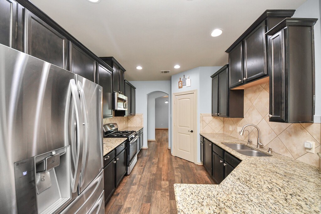 This beautifully maintained two-story home in Olympia Estates featuring 4 bedrooms,3.5 bathrooms,and over 3,000 sq ft of living space. Features include wood-look flooring,high ceilings,and a large living area perfect for entertaining. The kitchen offers granite countertops,dark cabinetry,tile backsplash,and stainless steel appliances with ample storage. The primary suite includes dual vanities,soaking tub,separate shower,and walk-in closet. Secondary bedrooms are well-sized with flexible use. The home also includes multiple full bathrooms with granite counters and updated finishes,a dedicated utility room,and a spacious upstairs area overlooking the main living space. Outside,the property features an attractive brick elevation,a covered front entry,a covered back patio,and a fully fenced backyard with green space for outdoor enjoyment. Overall,this home combines comfort,space,and functionality in a well-kept setting. MLS# 48925023